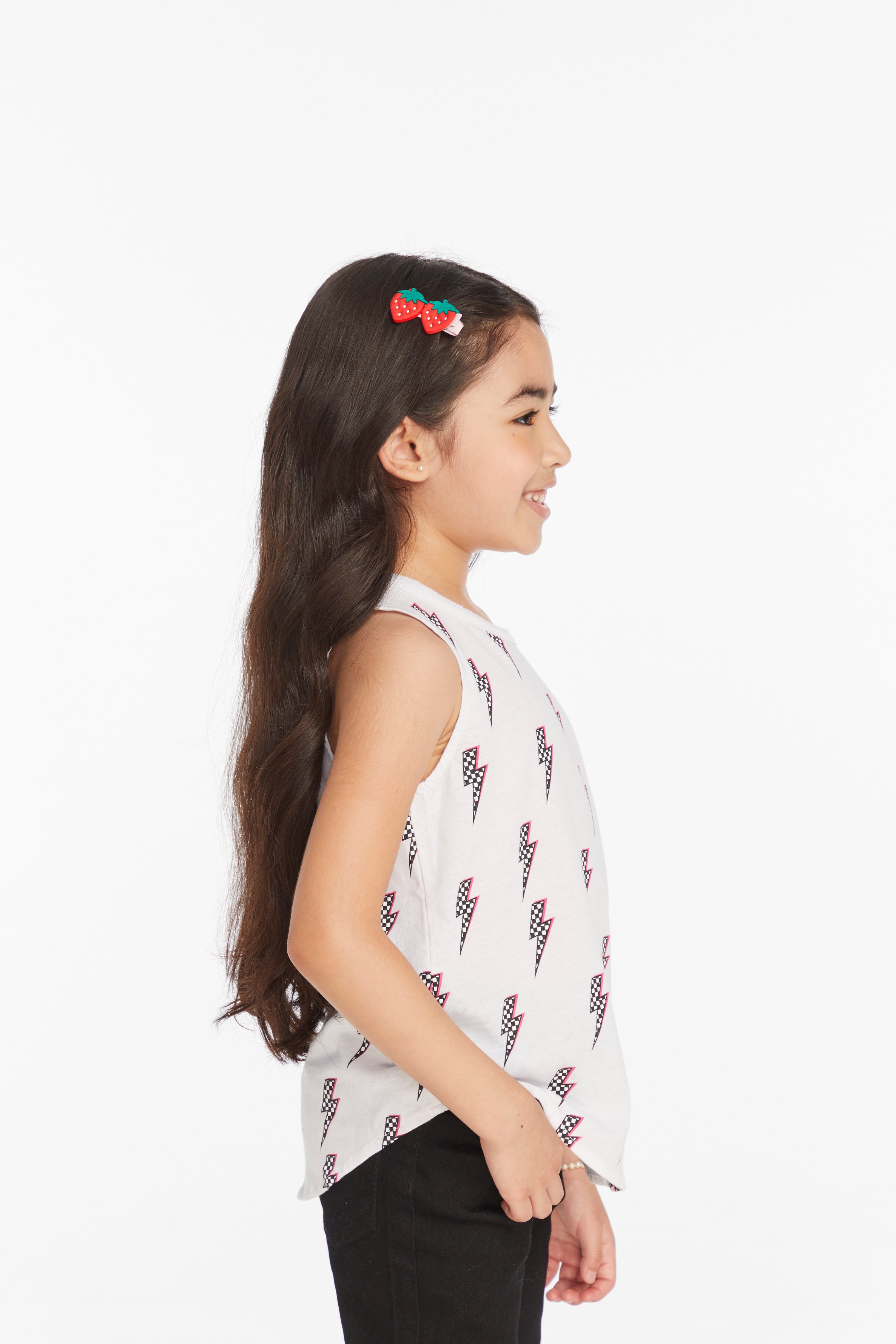 - Get your daughter's style charged up with our Checkered Bolts Muscle Shirt. This vintage jersey shirttail features trendy checked lightning bolt graphics on a classic white background. Made from a comfortable cotton polyester blend, it's perfect for pairing with black jeans and sneakers. (Don't let your daughter miss out on this electrifying fashion statement!)