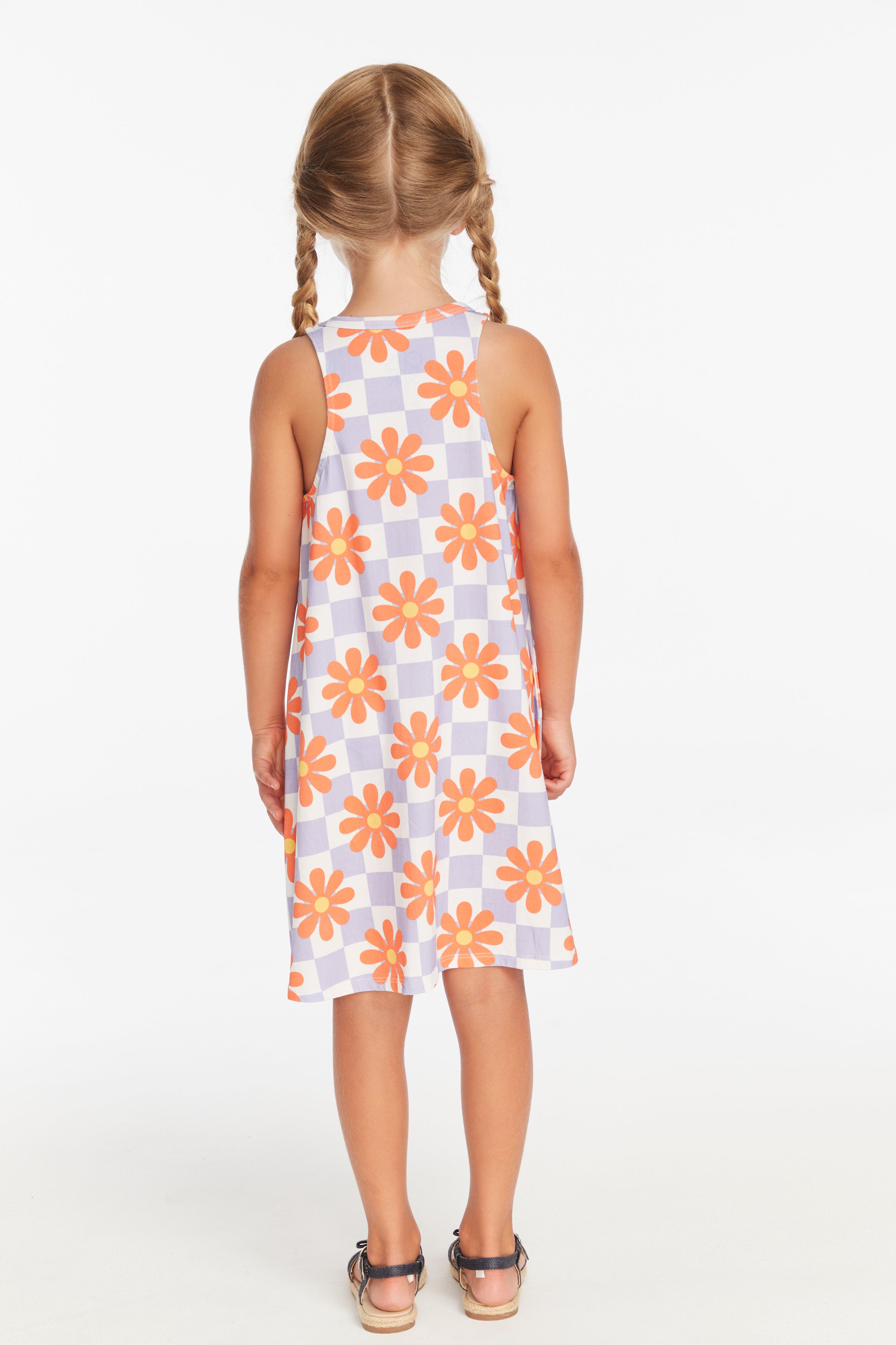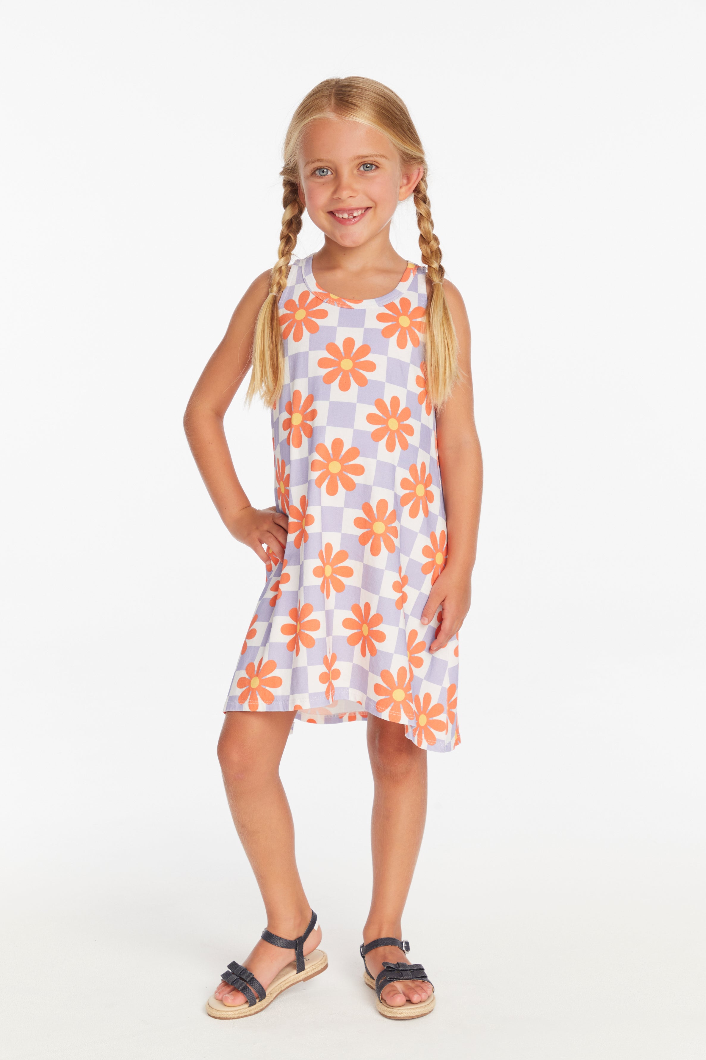 - Light and breezy for sunny days, this Checkered Floral Girls Tank Dress is perfect for your fashion-forward daughter. Made of 100% cotton, it features a playful orange flower graphic on a charming white and lavender checkered print. Pair with sandals for a cute and comfy outfit!