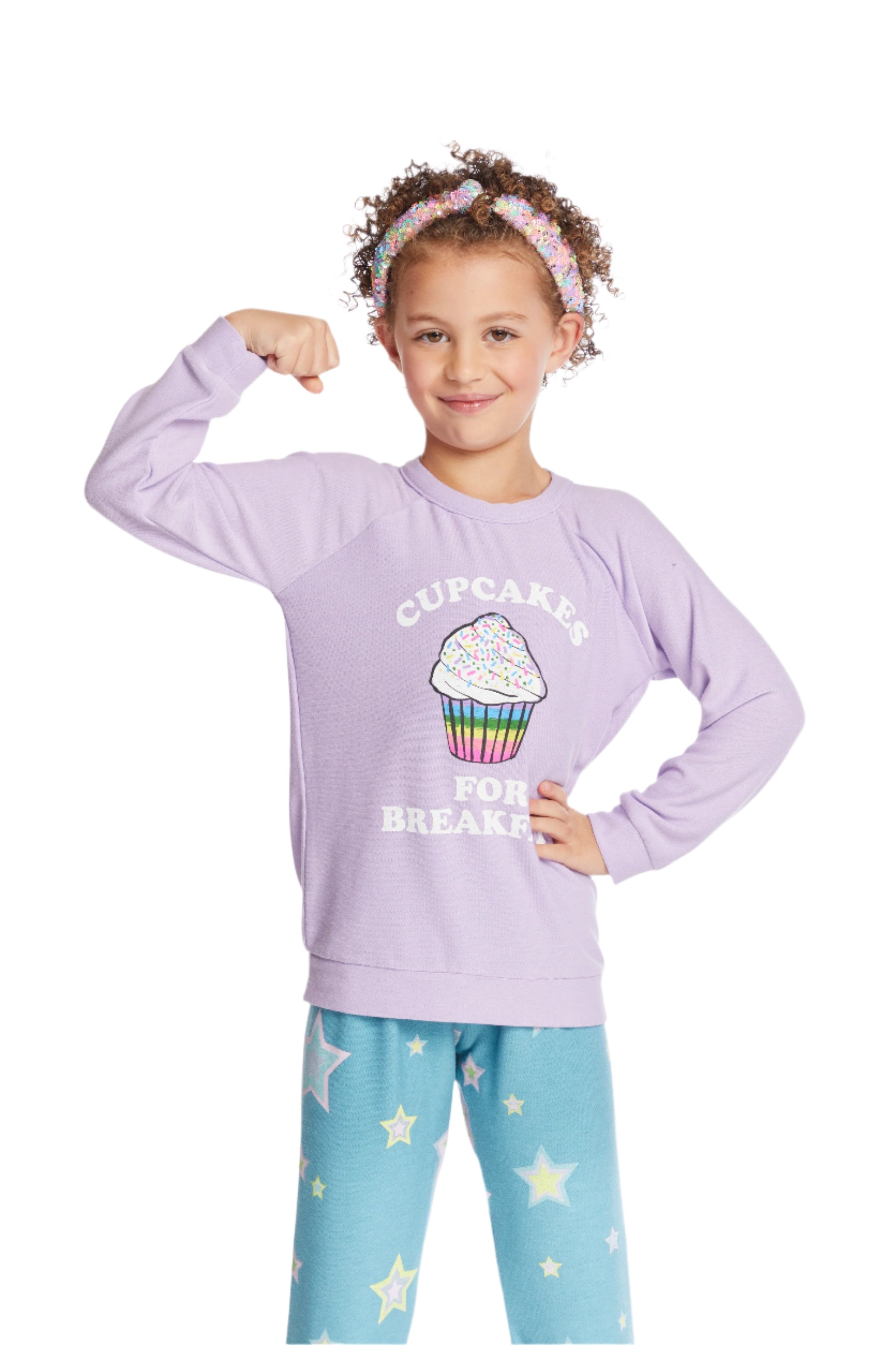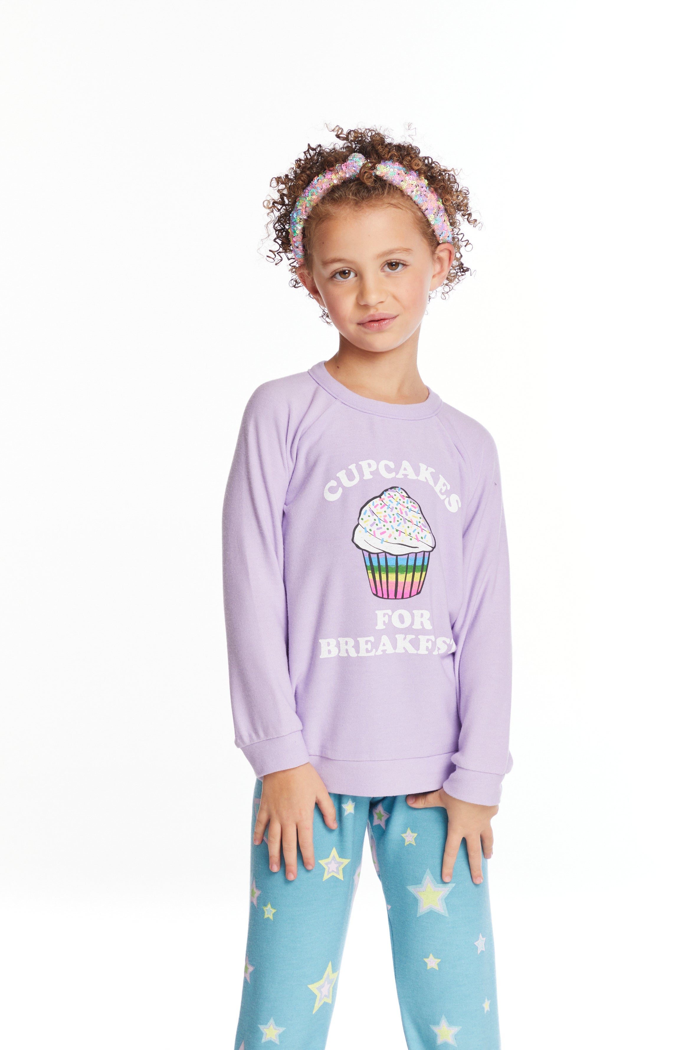 • Cupcakes for breakfast might not be a staple at your house, but hey, a girl can dream! The cute cupcake love knit raglan pullover design is framed with retro cute white bubble font. Soft dragonfly purple fabric brings a final touch of sweet appeal.