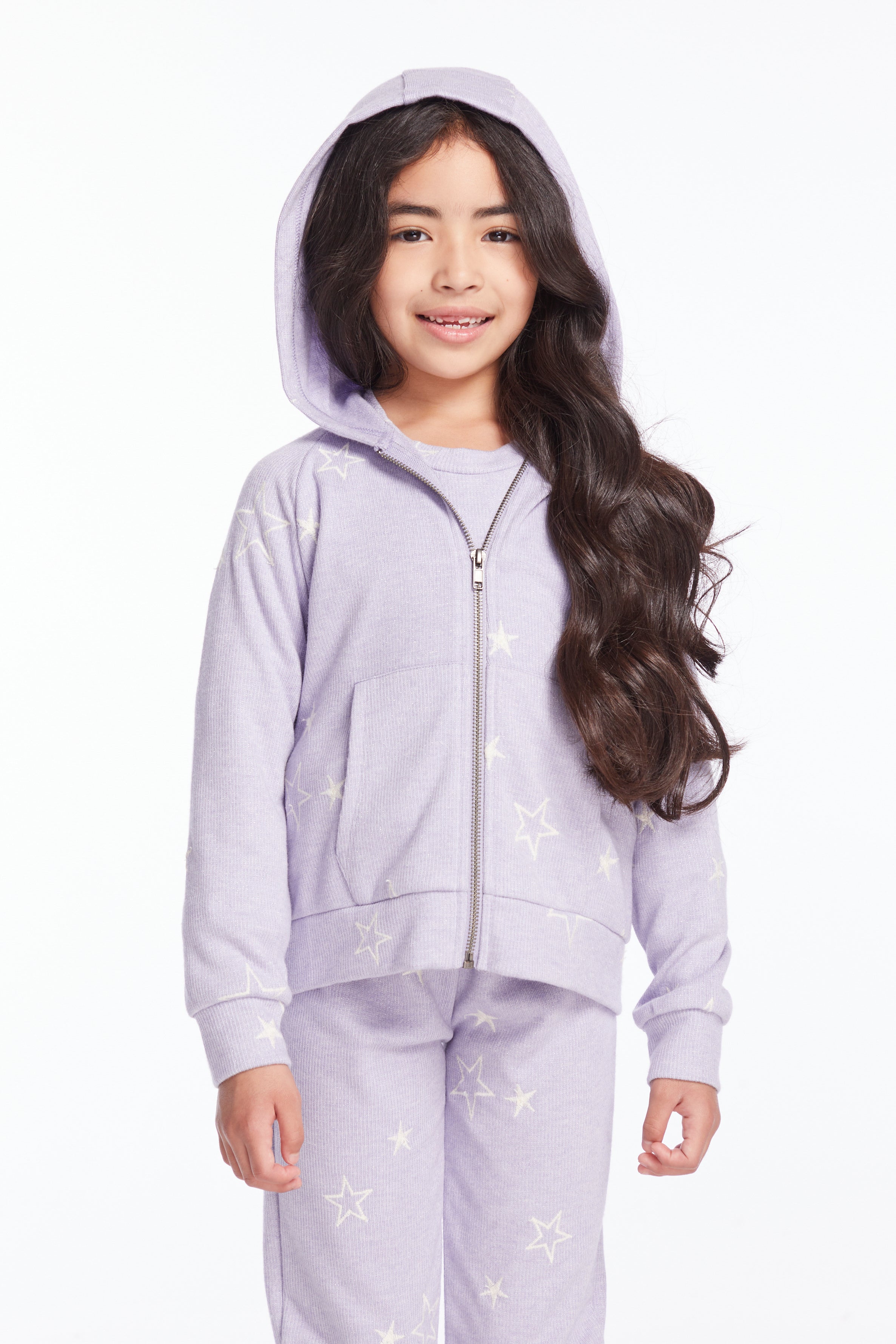 - Petite white stars adorn the lavender purple sky of this easy wearing zip up hoodie.
