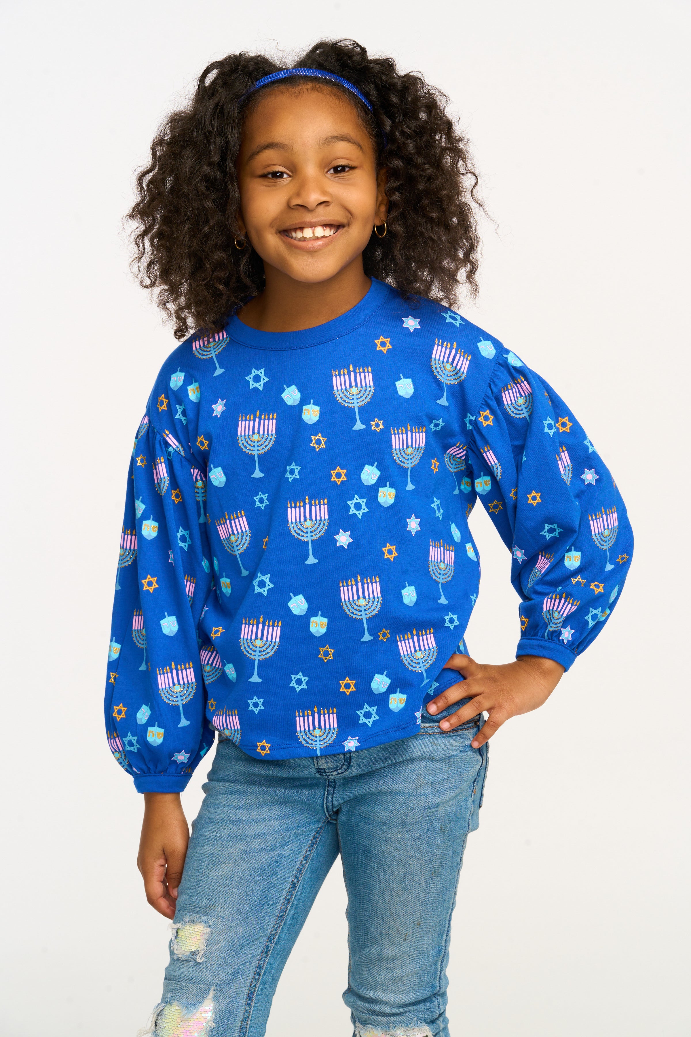 Crafted from recycled vintage jersey fabric in a snazzy lake blue, it comes with an all-over Menorah, Star of David and Dreidel graphic - perfect for the hip young lass in your life!