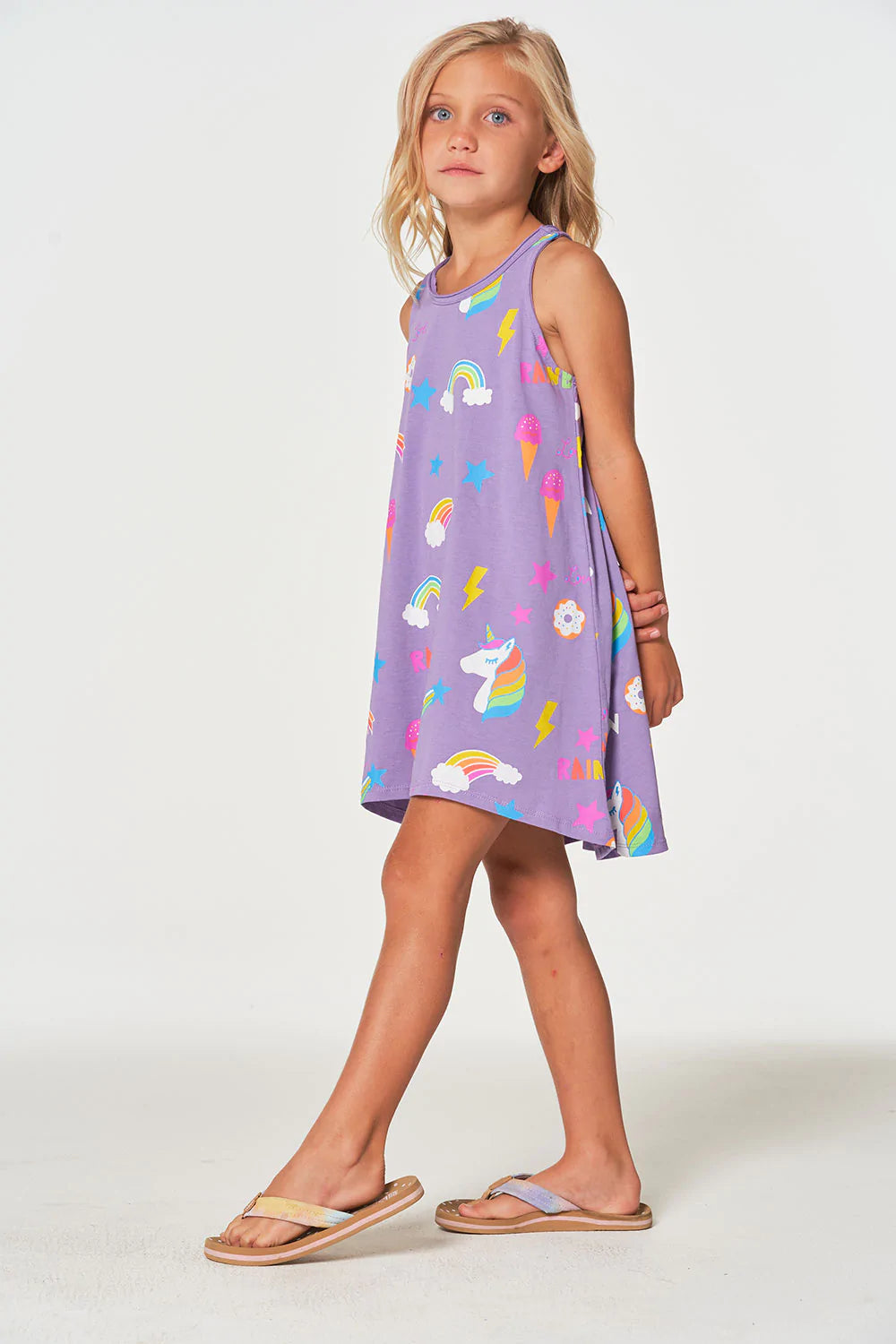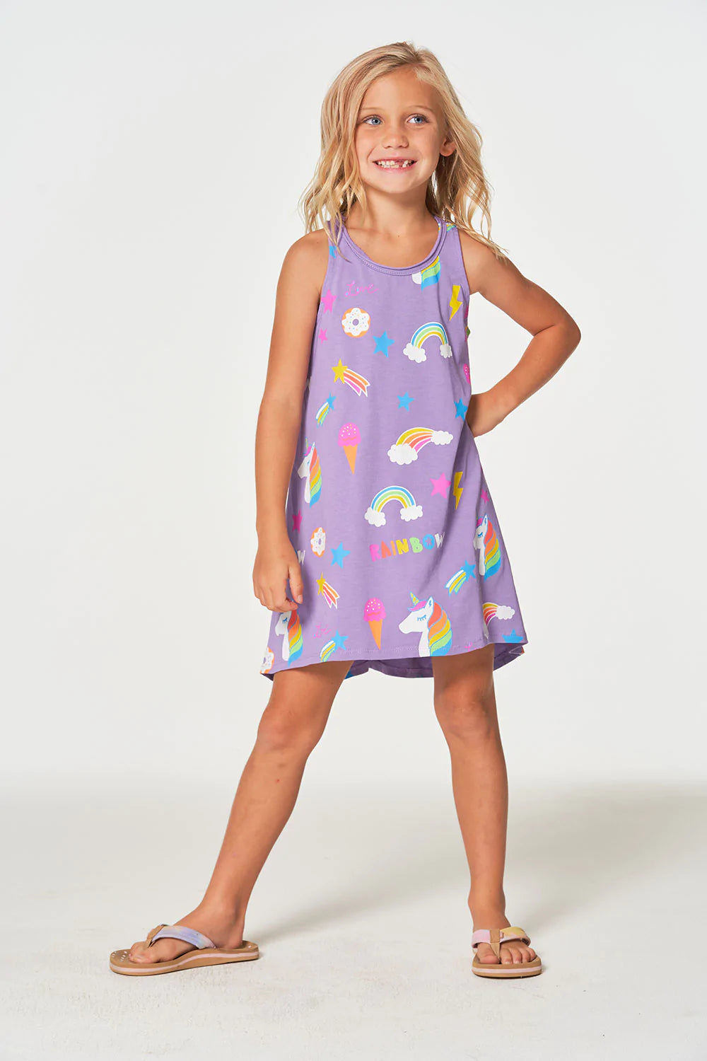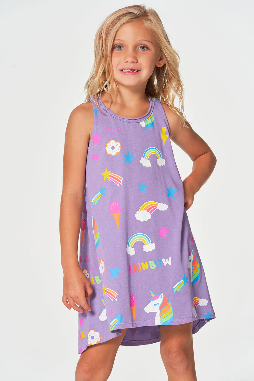 If unicorns are her spirit animal, she's going to need some tasty treats in hand. Luckily we included them all on this soft n' dreamy Girls Cotton Jersey Unicorn Treats Tank Dress in purple.
