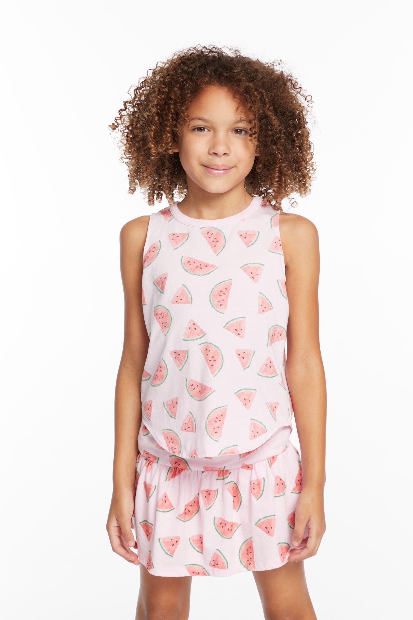 - Elevate her basics with the Shirttail Muscle Tee in a fun watermelon heaven color. Our Chaser Brand girl's top with a watermelon all-over pattern is ideal for any summer outing. Style with our Peplum Skort in a cool Avalon hue for the perfect warm-weather outfit.