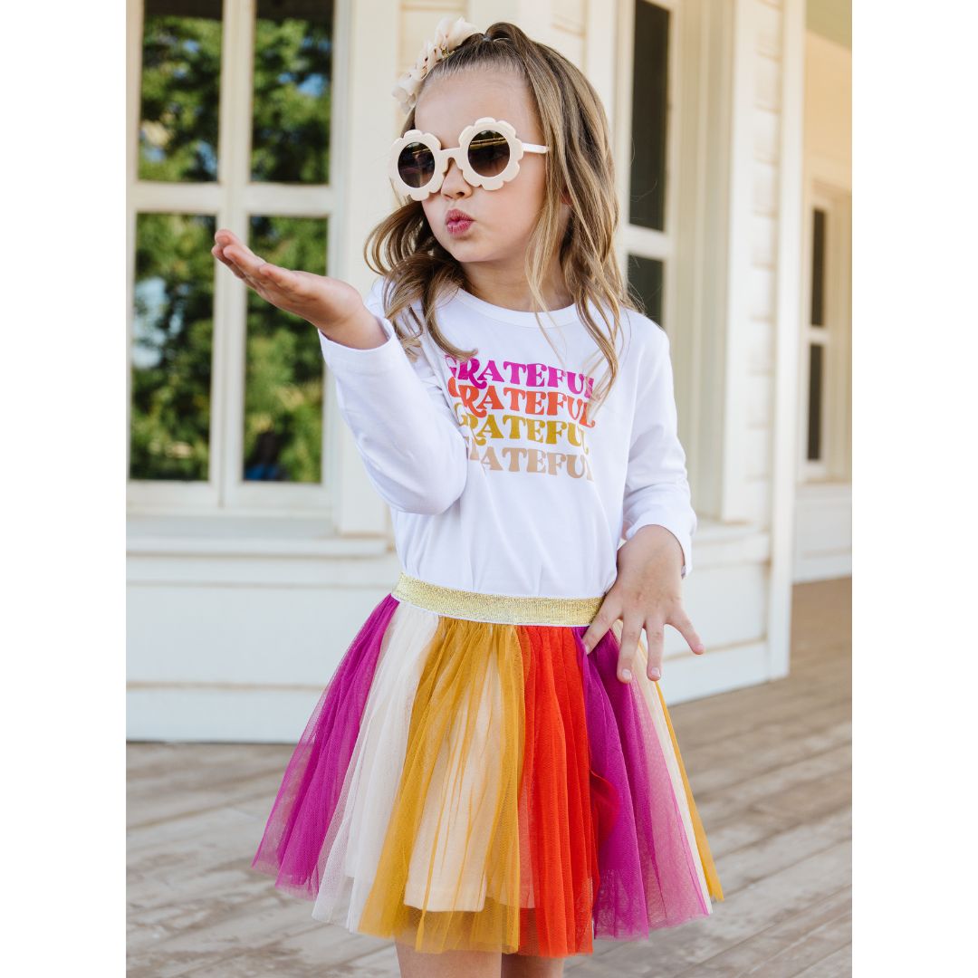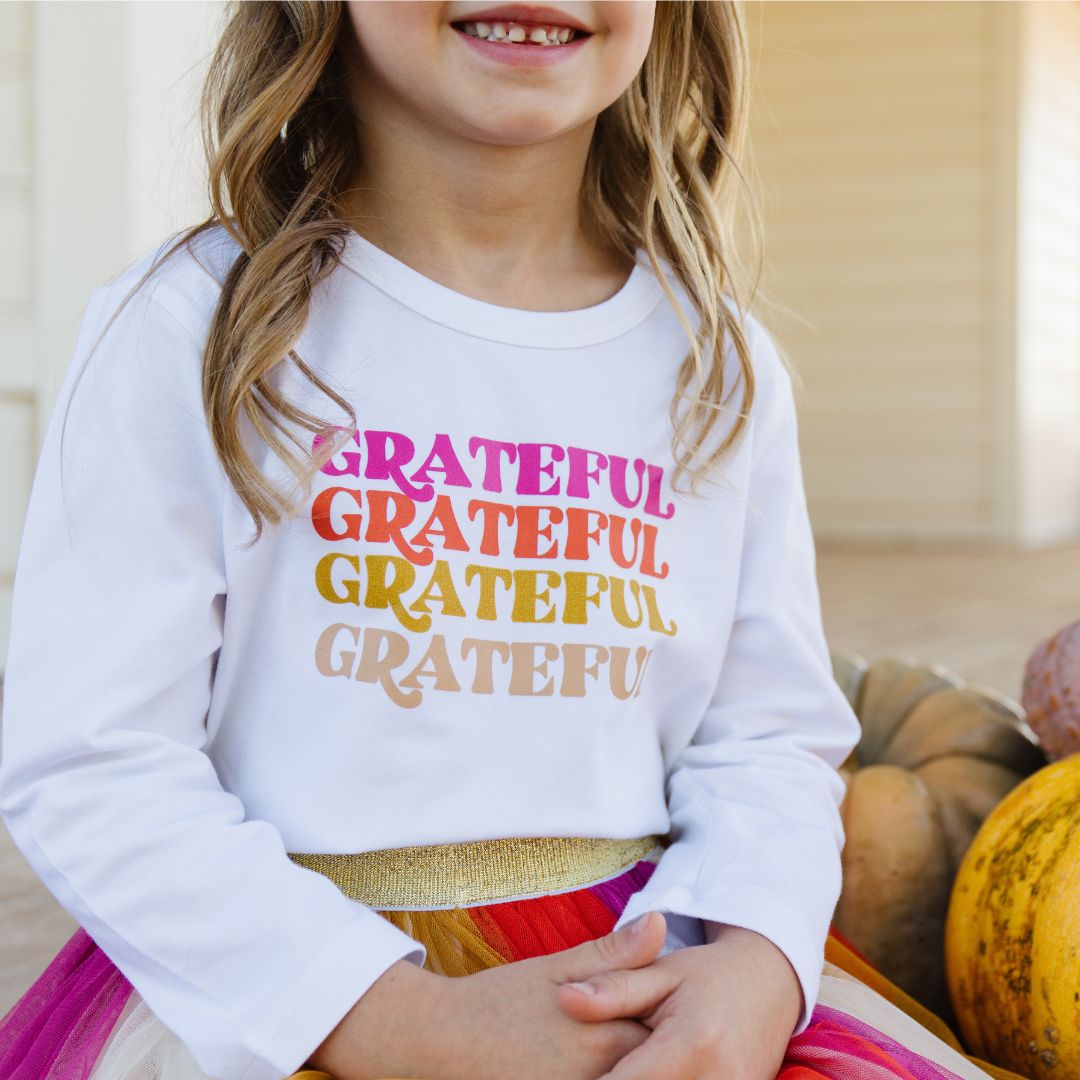 The Grateful L/S Shirt is a fun and festive shirt for kids celebrating Thanksgiving!