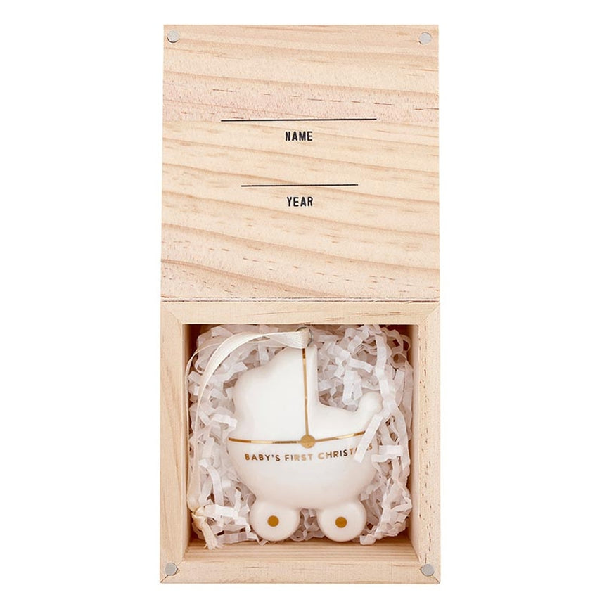 - Celebrate your little buddle of joy's first Christmas with this charming ceramic baby carriage ornament.