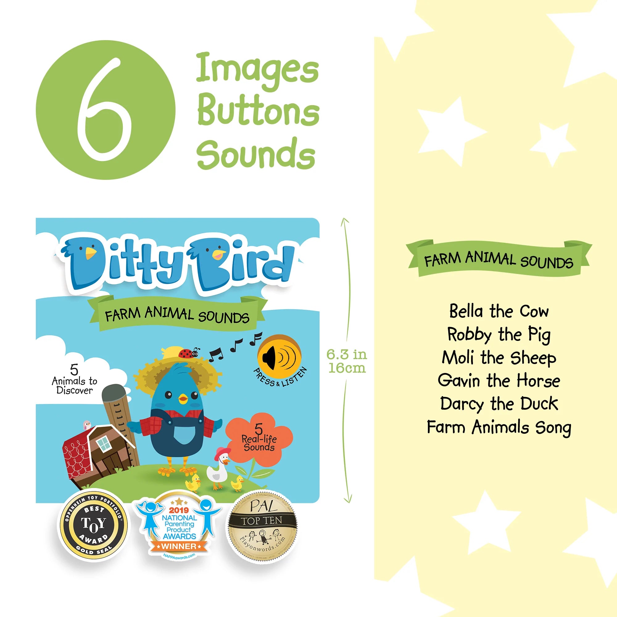 Let's join Ditty Bird and take a walk around the farm. Press the sound button on each page to listen to real-life animal sounds and ‘Moo’, ‘Baa’, ‘Quack’ along with our favorite animal sounds song!