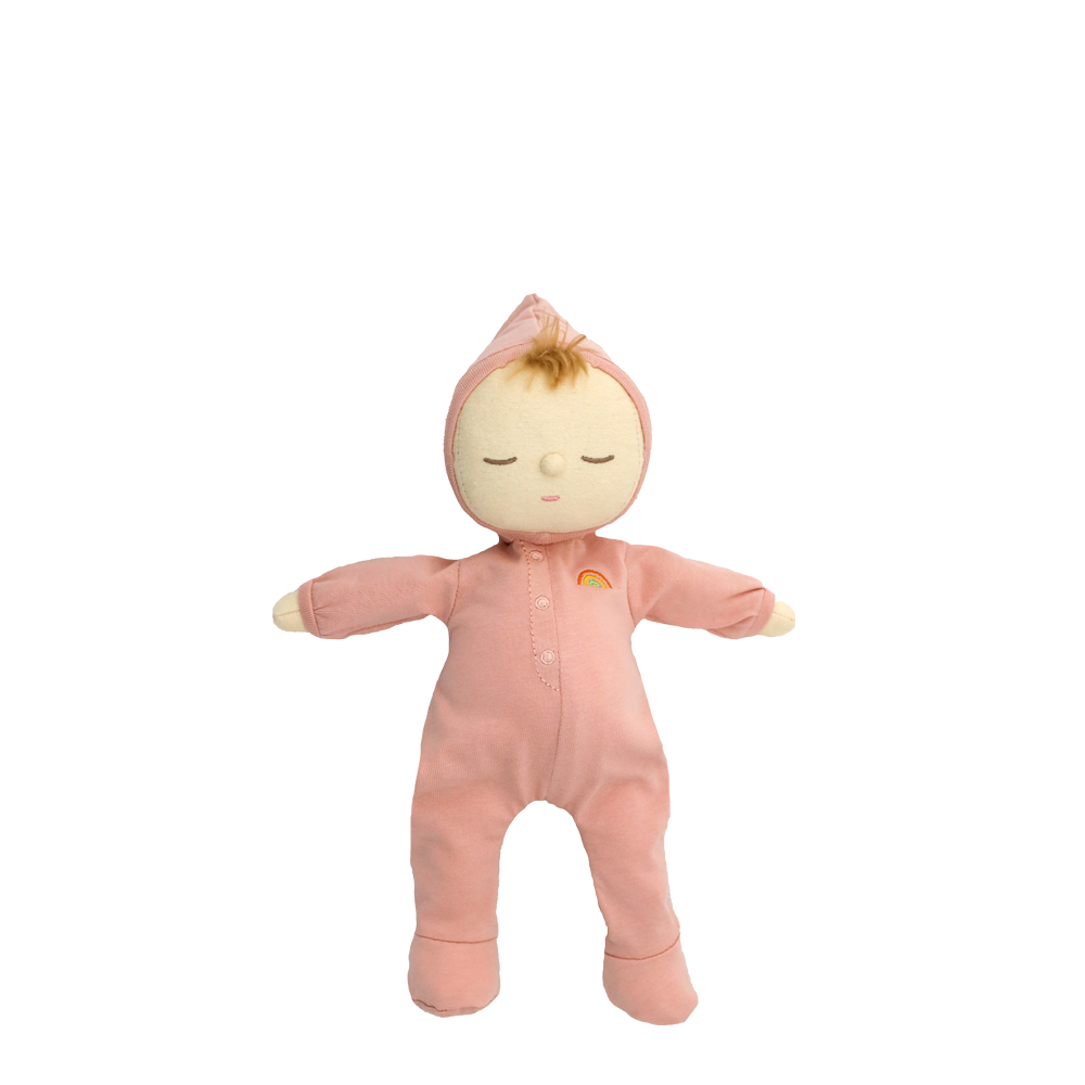 • Dozy Dinkums wear a non-removable cotton onesie with an embroidered rainbow on heart area.