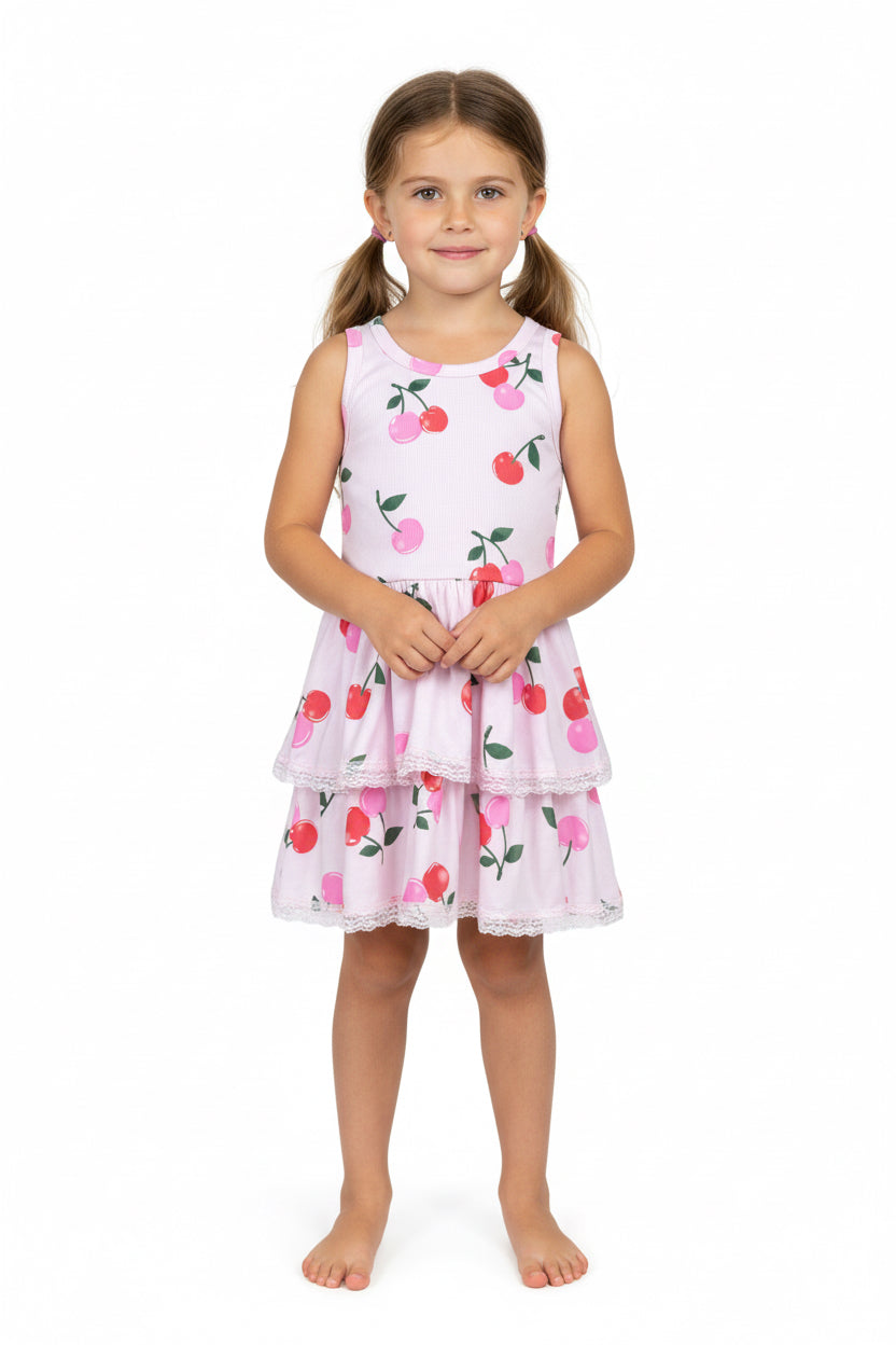 FBZ Pink & Red Cherry Print Tiered Sleeveless Pink Dress