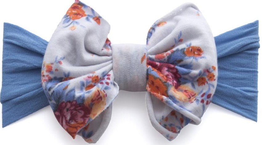 - A floral printed jersey bow is attached to a mauve signature BABY BLING nylon headband.