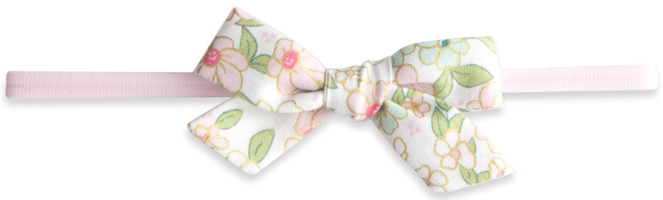 - This headband is made with the fabric of the signature Baby Bling headbands but in a skinny version and accented with a floral cotton print bow attached to the headband.