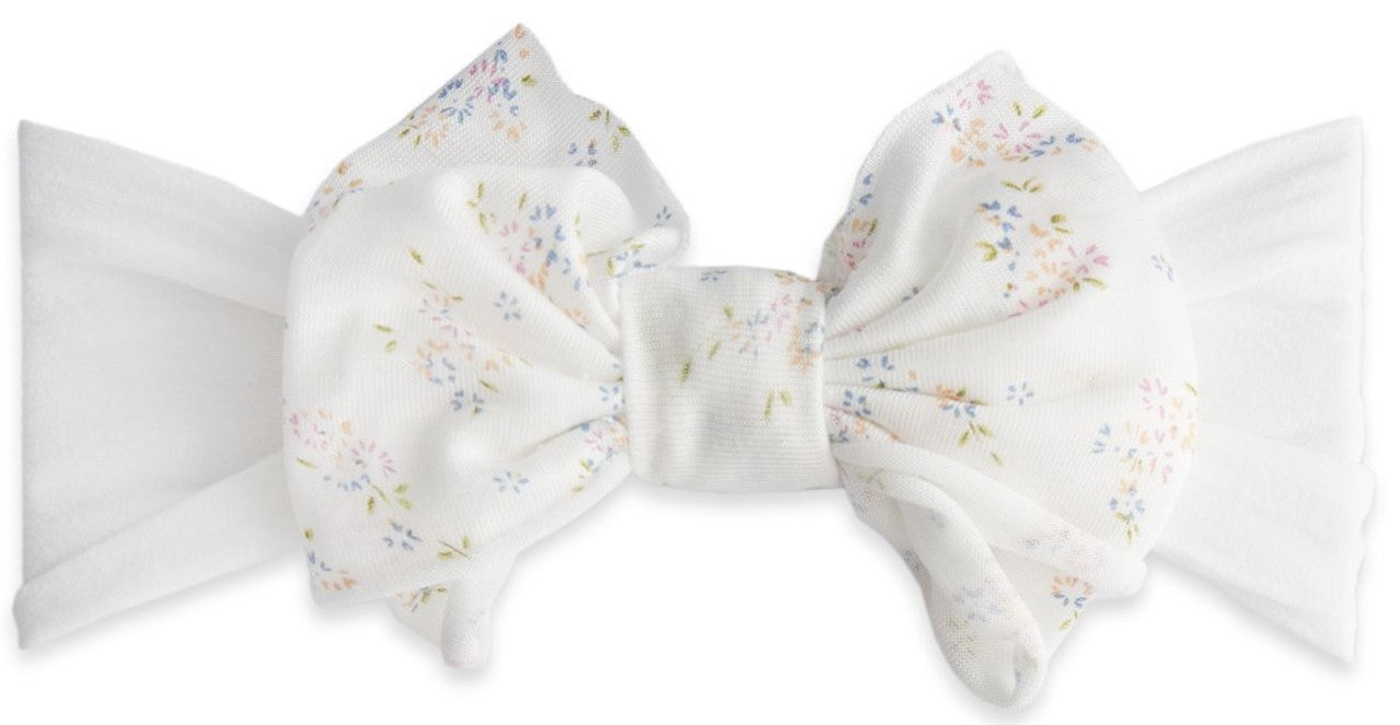 • A white floral printed jersey bow is attached to a white signature BABY BLING nylon headband.