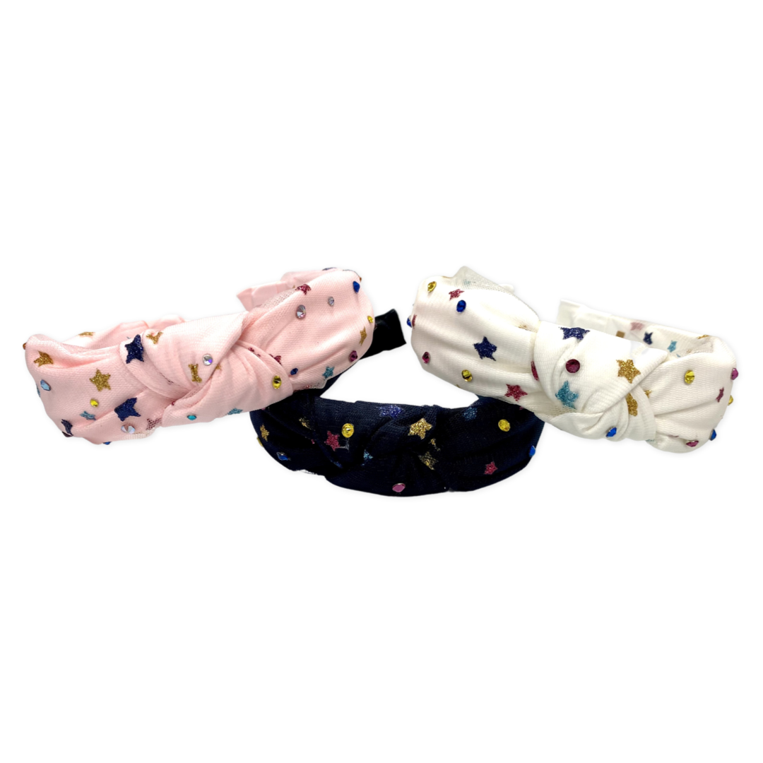 - This structured,and oh so comfortable headband, is accented with metallic star printed fabric and blinged to perfection.