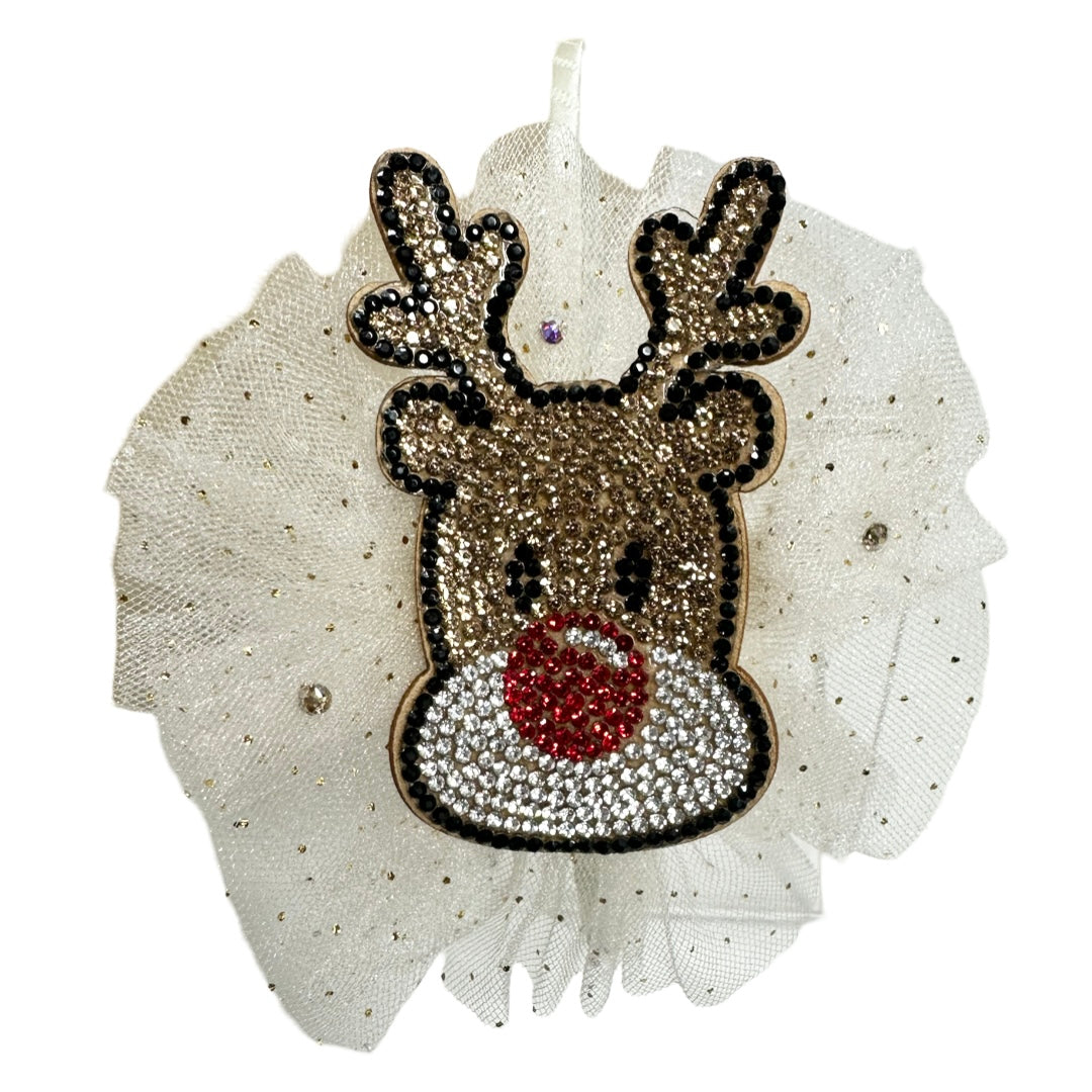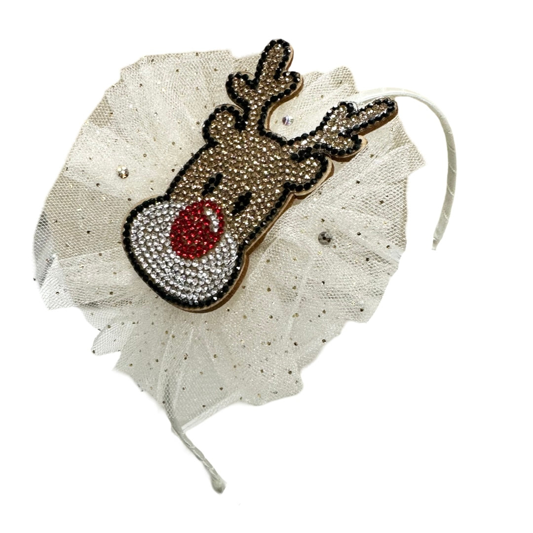 • Our favorite Bari Lynn headband is accented with a gold tulle and a rhinestone reindeer applique in the center.