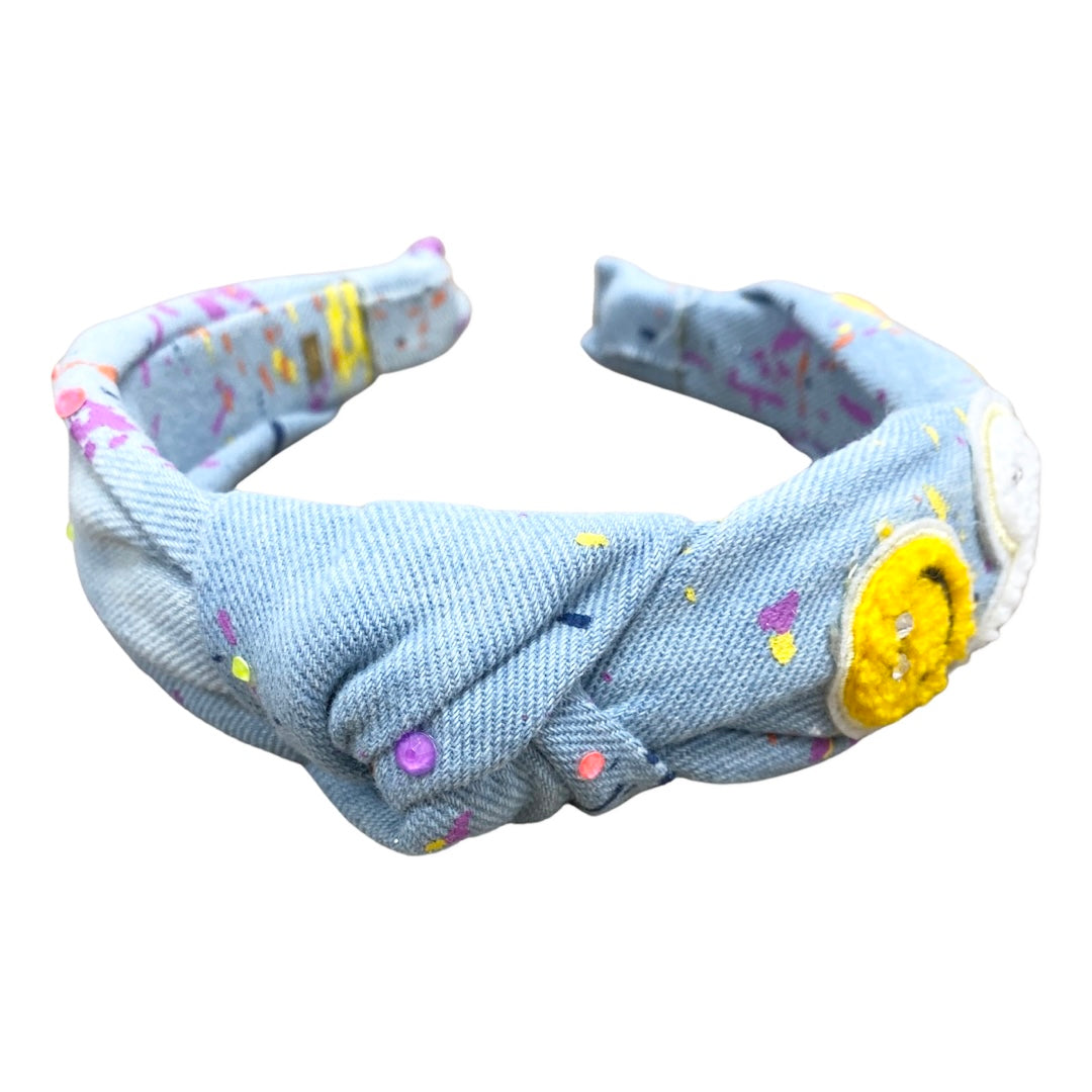 Bari Lynn Splatter Paint Denim Headband with Crystals - Smiley & Heart