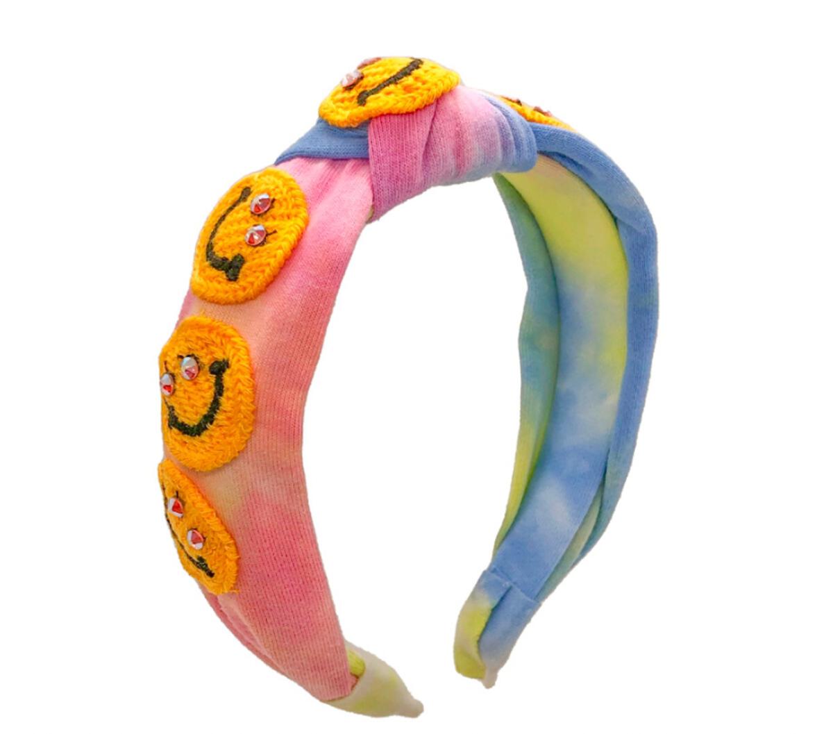 Bari Lynn Tie Dye Smiley Face Patch Knot Headband with Crystals - Rainbow