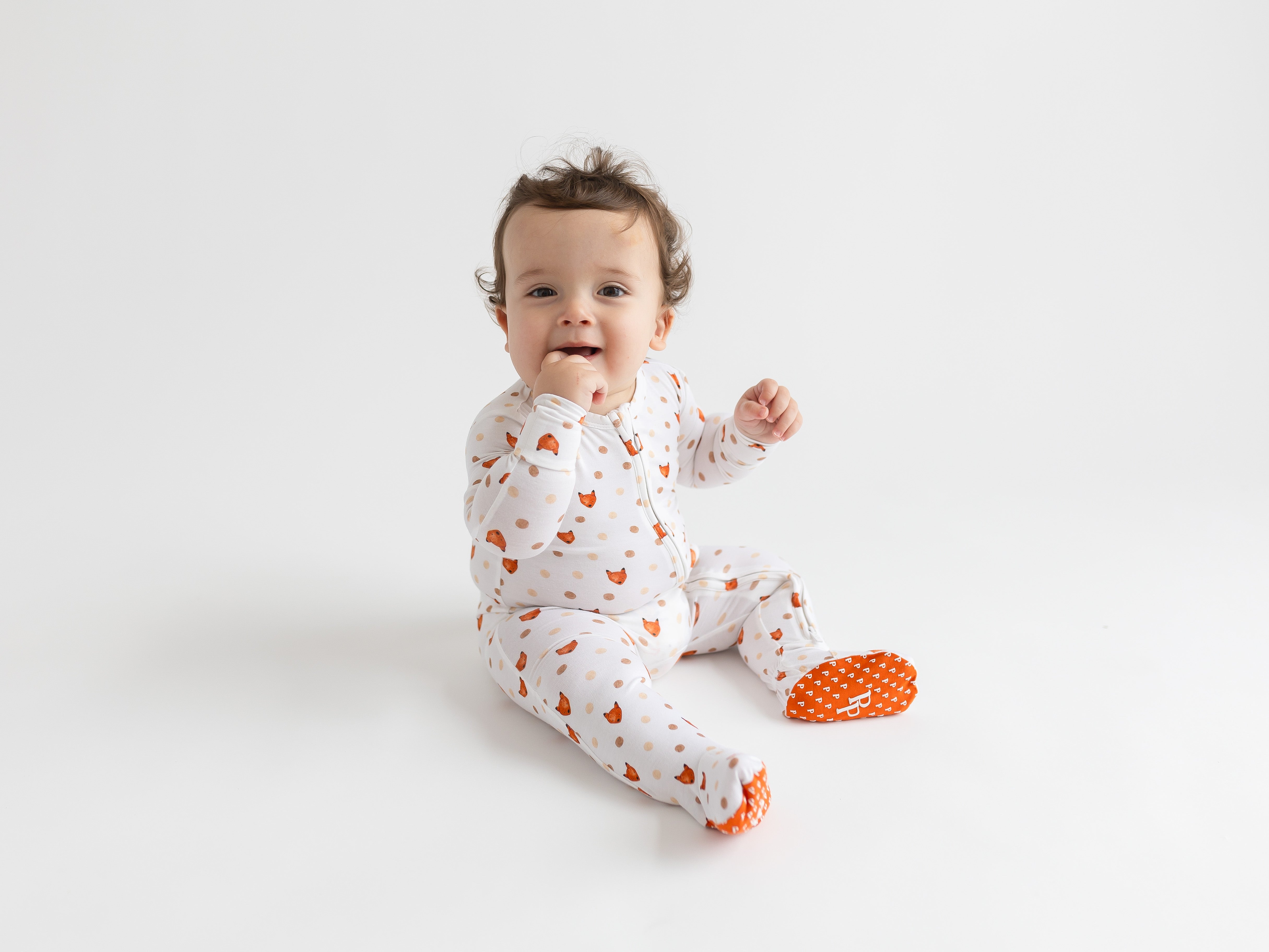 Bamboo one-piece footie with reversible zipper opening. New reversible zippers are perfect for late-night changes and the ease of not undressing your peanut. Zip up or down for a quick change. Signature Posh Peanut Footie grips, elastic backing on footies for a snug fit and fold-over mittens in sizes NB and 0-3M. Buttery soft jammies so cute you can wear them out!