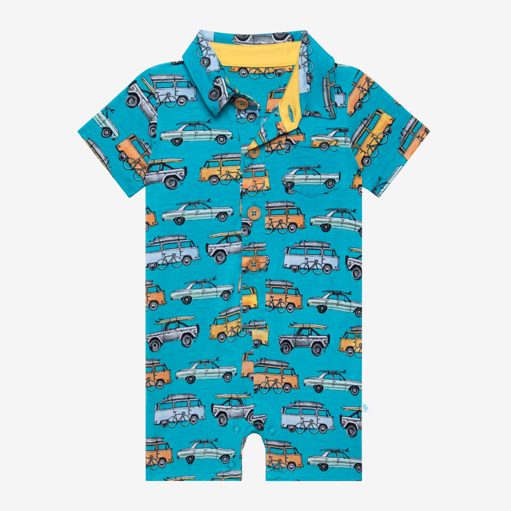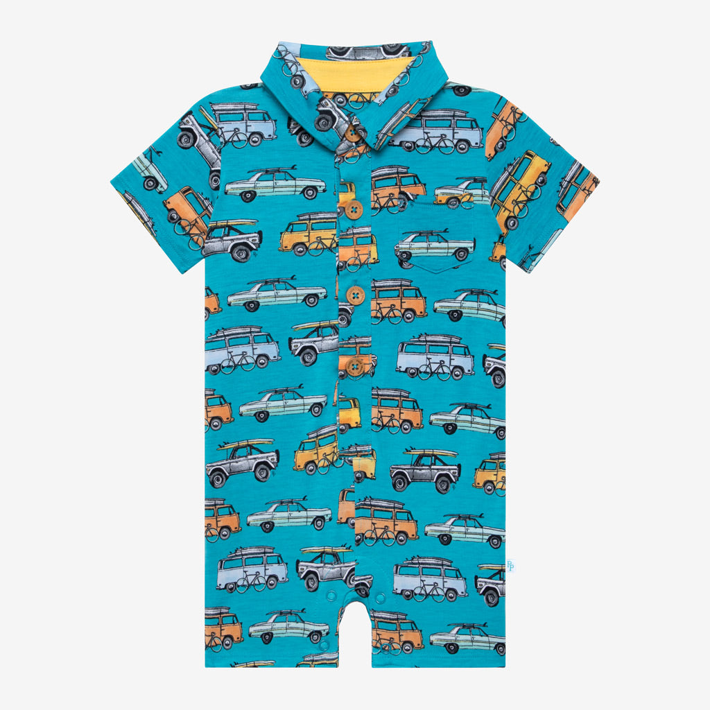 Cute, yet chic! Dress up your little one in our new collared shortalls made from our signature Päpook® viscose from bamboo. Beautifully lined collar in complementing trim. Short sleeve shortalls are perfect for warm weather or layered for cooler months. Functional wood buttons and snaps for easy changes.