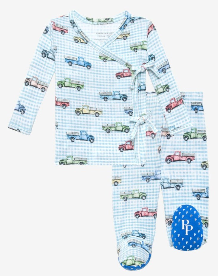 Kimono one-piece bodysuit with matching footed jogger in coveted Viscose from Bamboo. Wrap your peanut in style with fold-over kimono style with tie closure. Kimono style is the perfect comfort outfit with smart wrap design and nothing pulled over your peanut's head. Fold-over mittens are added for extra protection from self-scratching and extra warmth. Stretchy bamboo is buttery soft and snuggly for newborns.