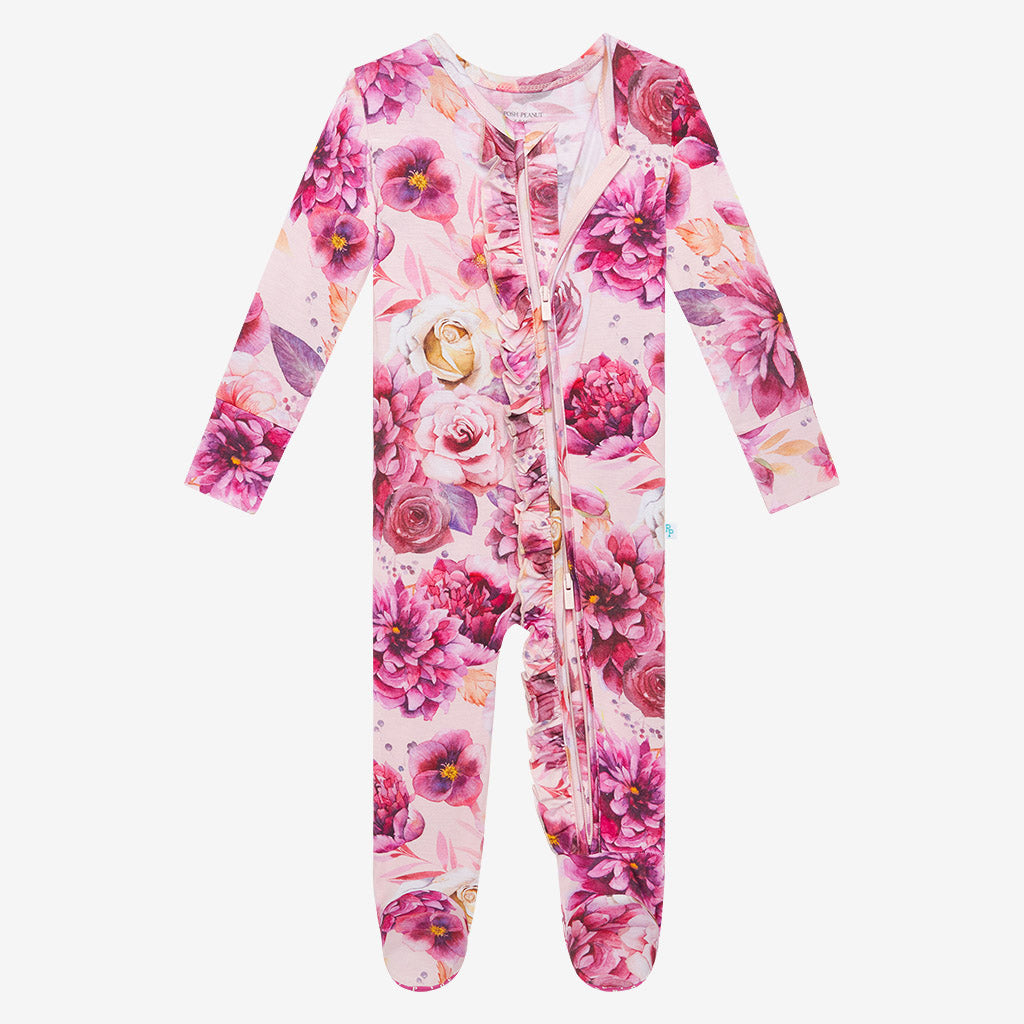 Viscose from bamboo one-piece footie coverall with reversible zipper opening. New reversible zippers are perfect for late-night changes and the ease of not undressing your peanut. Zip up or down for a quick change. Signature Posh Peanut Footie grips, elastic backing on footies for a snug fit and fold-over mittens in sizes NB and 0-3M. Buttery soft jammies so cute you can wear them out!