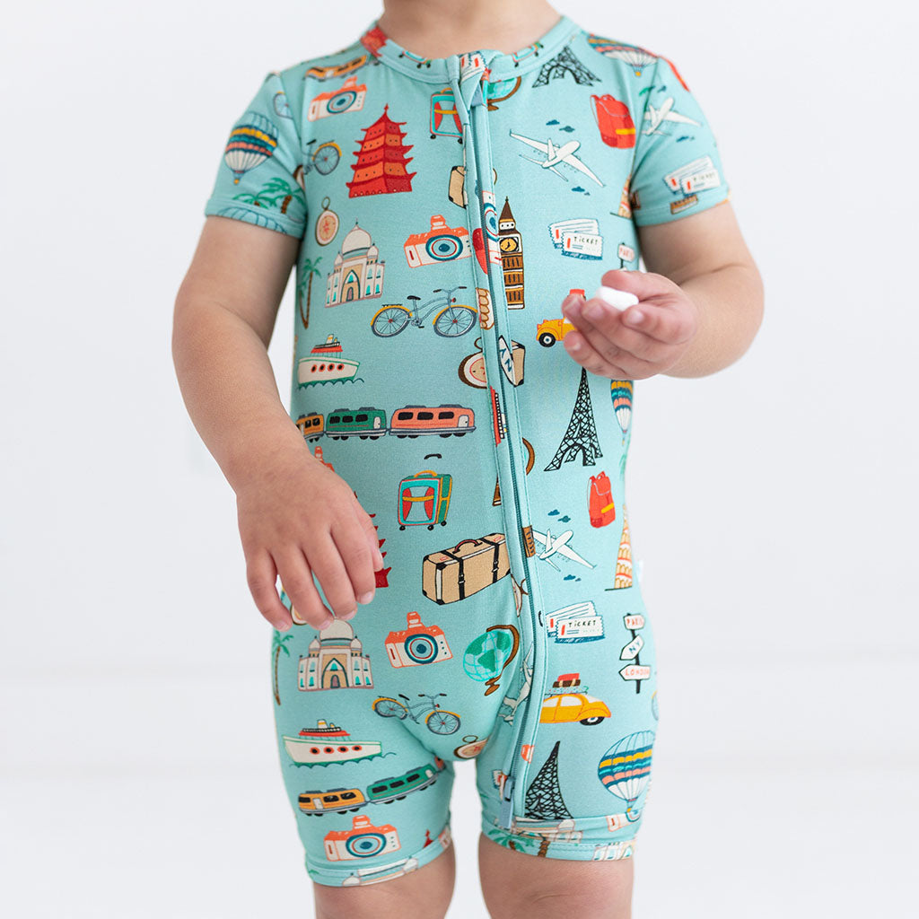 Playtime is easy breezy in the short sleeve shorties! Thoughtfully designed with a functional zipper for easy on/off making changes a breeze, these shorties are both peanut and grown-up approved. Super soft and so lightweight thanks to our signature Päpook® viscose from bamboo, these are the coolest shorties of the summer!