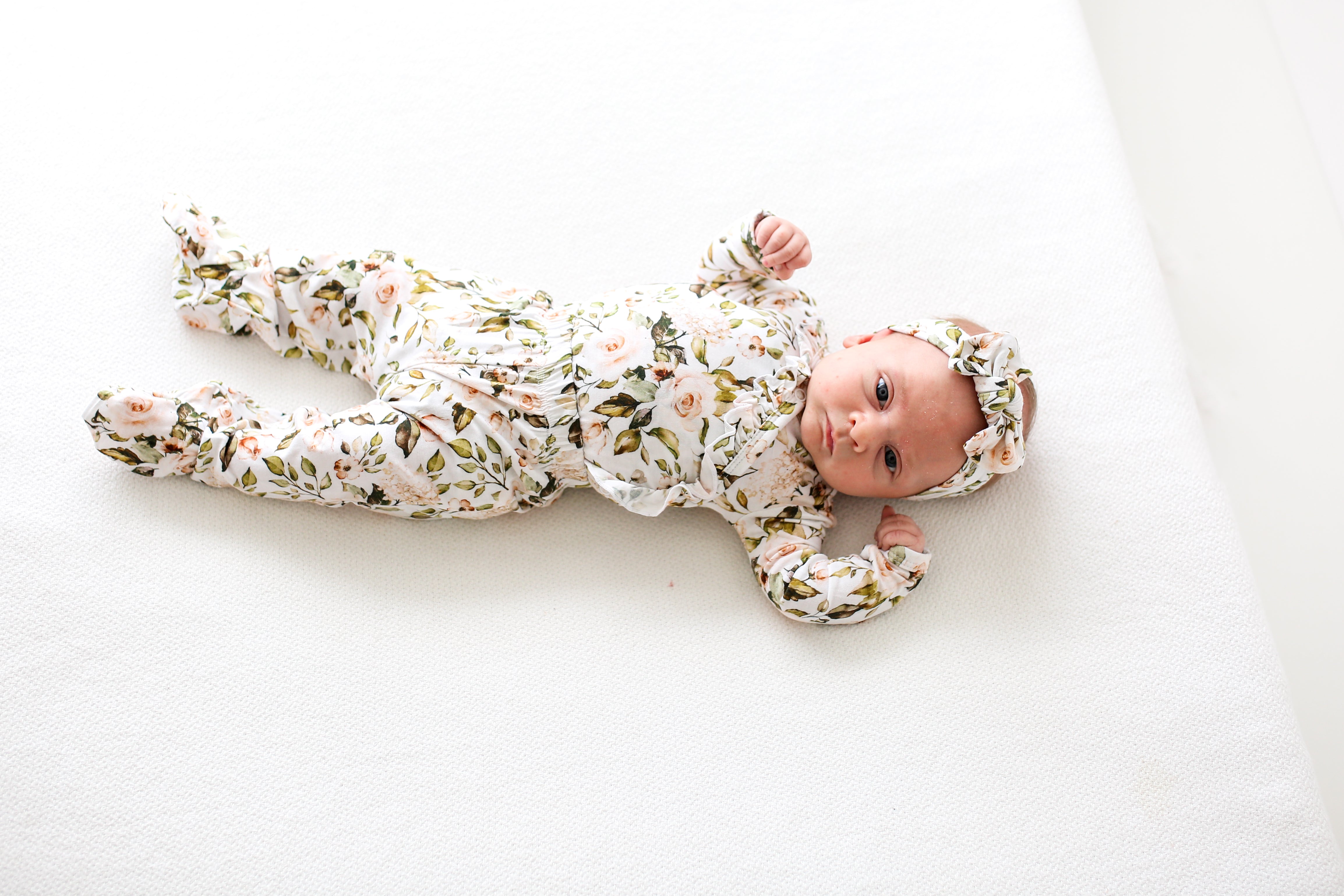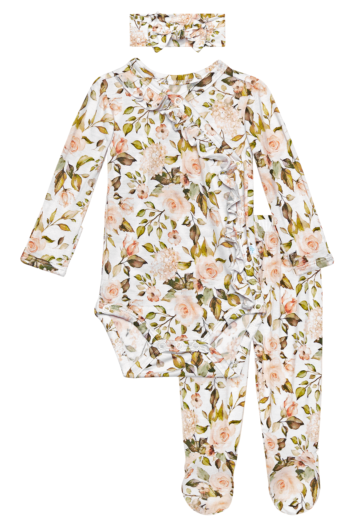 Kimono bodysuit with matching footed jogger and matching headband set in our coveted viscose from bamboo. Wrap your peanut in style with fold-over kimono style bodysuit with snap buttons. Kimonos are the perfect comfort outfit with smart wrap design. Fold-over mittens are added for extra protection from self-scratching and extra warmth. Stretchy bamboo is buttery soft and snuggly for newborns.