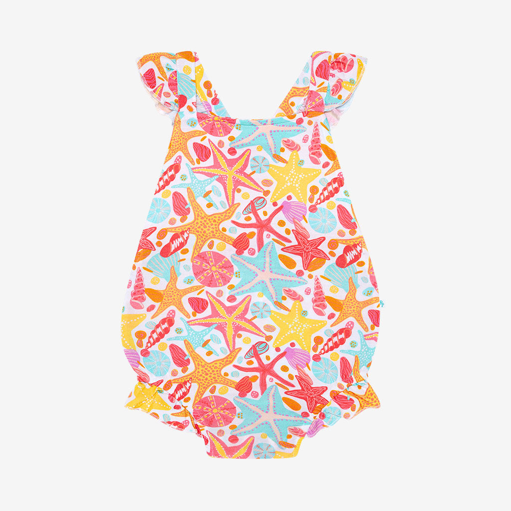 The bubble romper with ruffled cap sleeves in a signature design! Comes with inseam snaps for an easy diaper change and is made from our coveted Päpook® viscose from bamboo for extra comfort and all-day wear.
