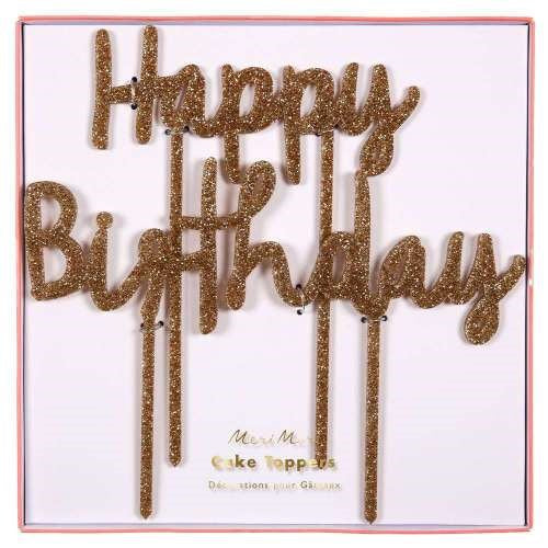 - With a Happy Birthday message created in gold glitter acrylic, this excellent cake topper is sure to give your baking an extra touch of shimmer and shine!