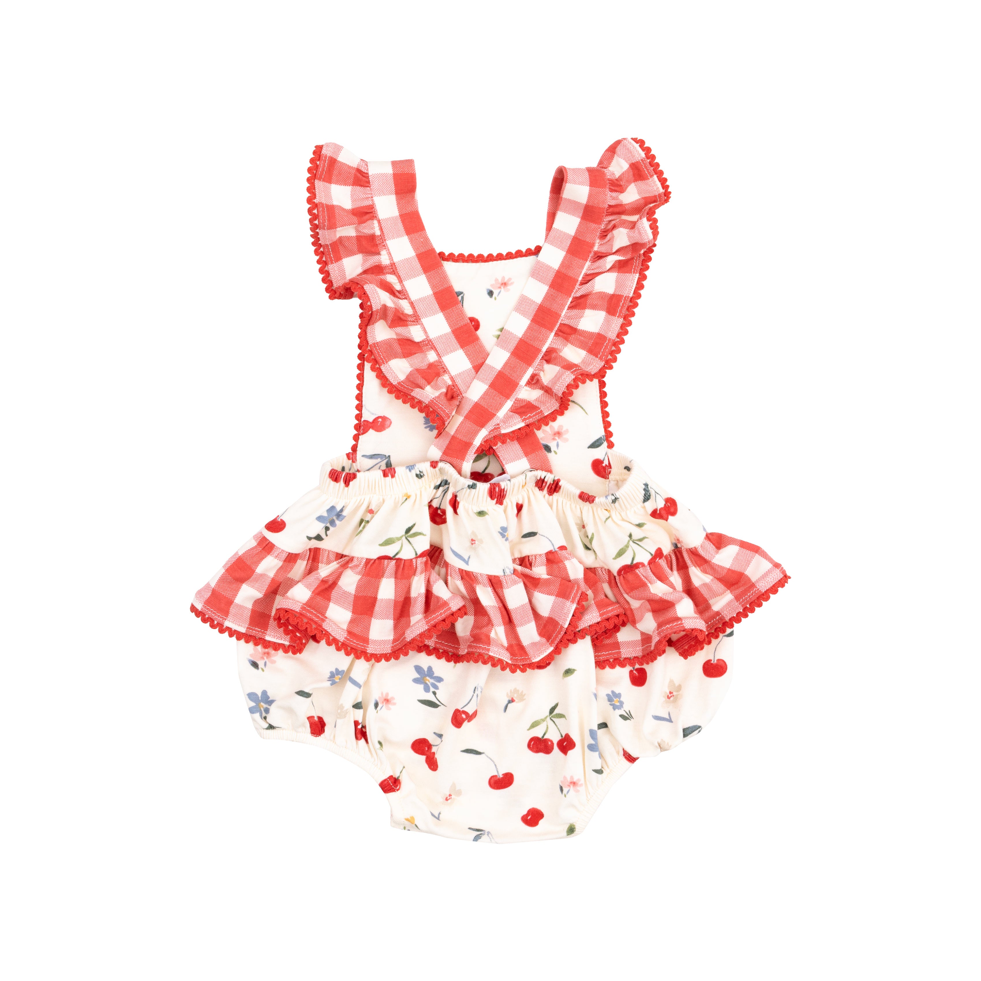Angel Dear Gingham Ric-Rac Ruffle Sunsuit - Watercolor Cherries
