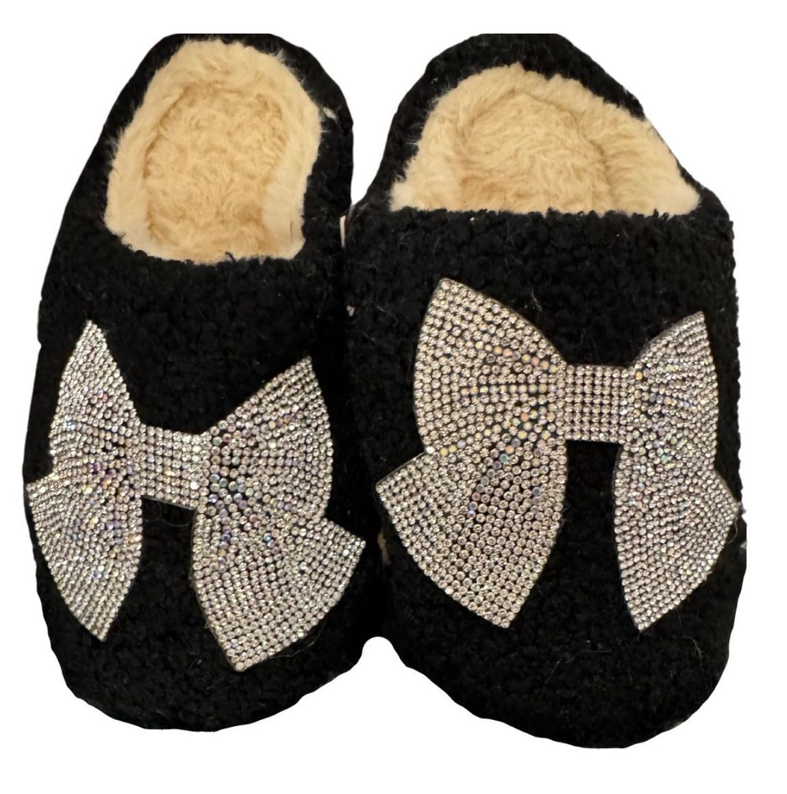 - Soft and cute, these slippers are embellished with a large rhinestone bow embellishment on each slipper!