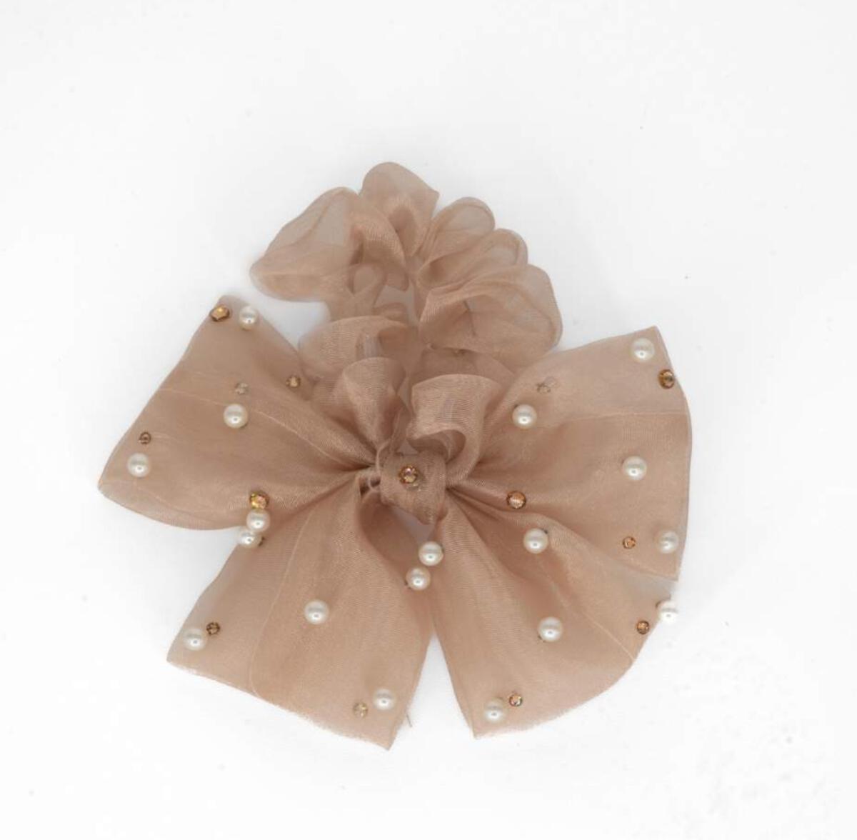 Bari Lynn Tulle Bow Scrunchie with Pearls & Swarovski Crystals - Nude