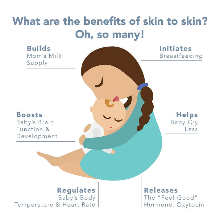 • Once the two flaps are open, the baby's chest and belly are fully exposed for skin to skin connection. The elastic waistband allows for easy dressing and (as easy as they can get) diaper changes.
