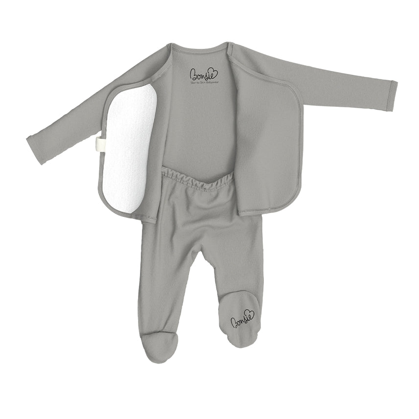 • Once the two flaps are open, the baby's chest and belly are fully exposed for skin to skin connection. The elastic waistband allows for easy dressing and (as easy as they can get) diaper changes.