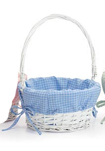 - White painted willow basket with liner in a solid color accented with a white criss cross pattern.