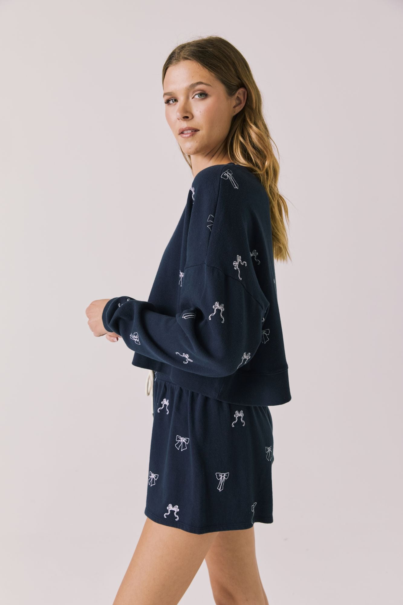 - The Tossed Bows Long Sleeve offers a cozy yet chic loungewear option with its high neckline and long sleeves.
