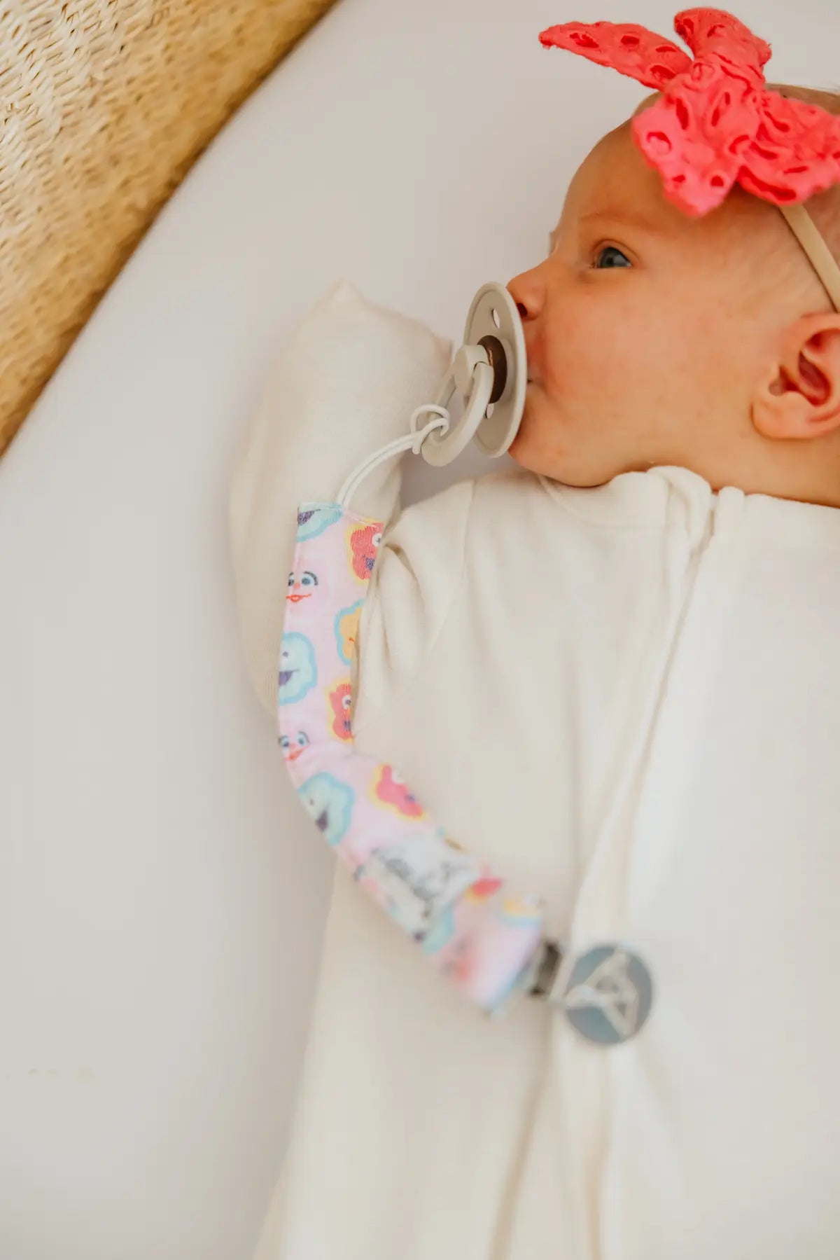 A chic way to keep baby's pacifier close at hand.