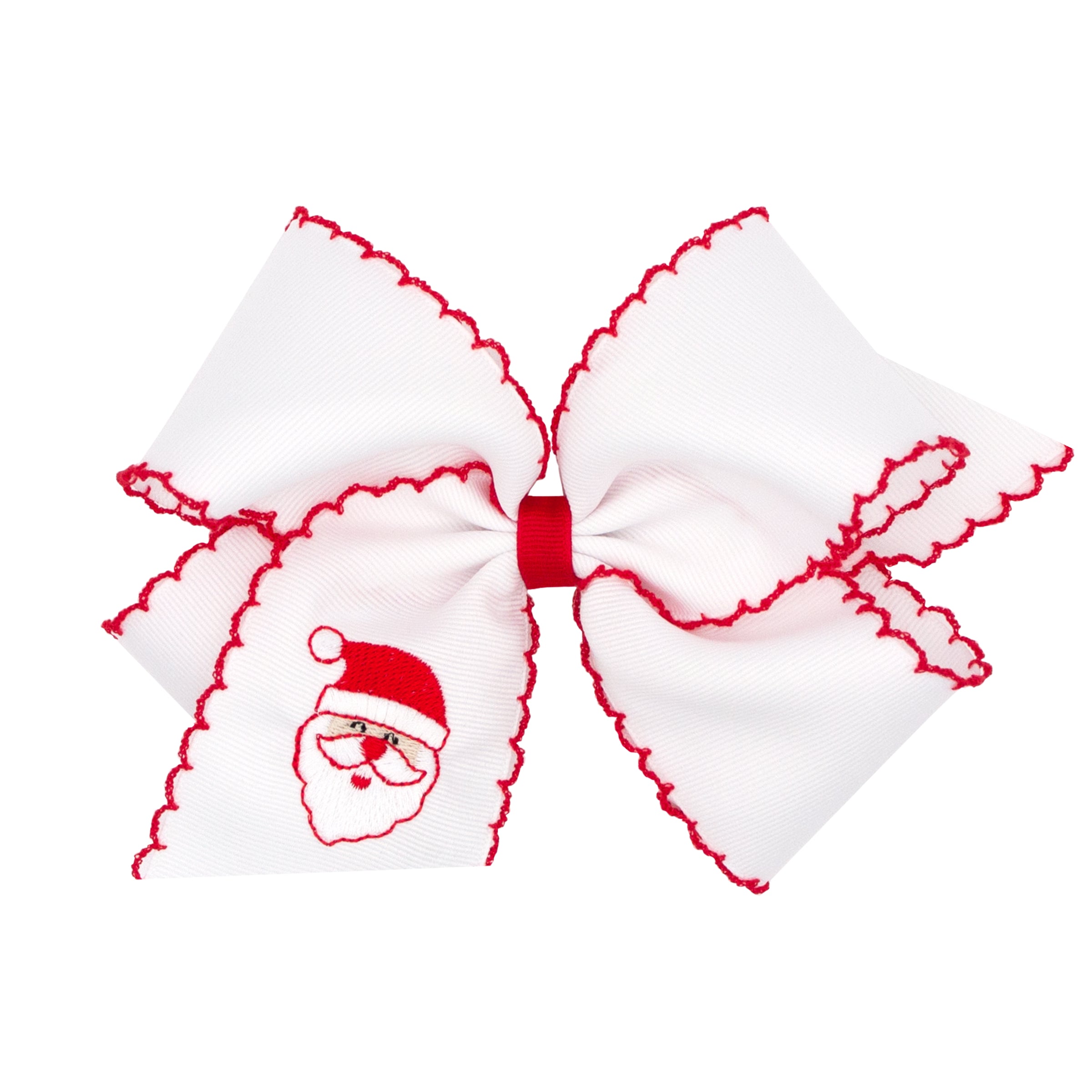 Embroidered Moonstitch Grosgrain Hair Bow on Clippie - Santa on White