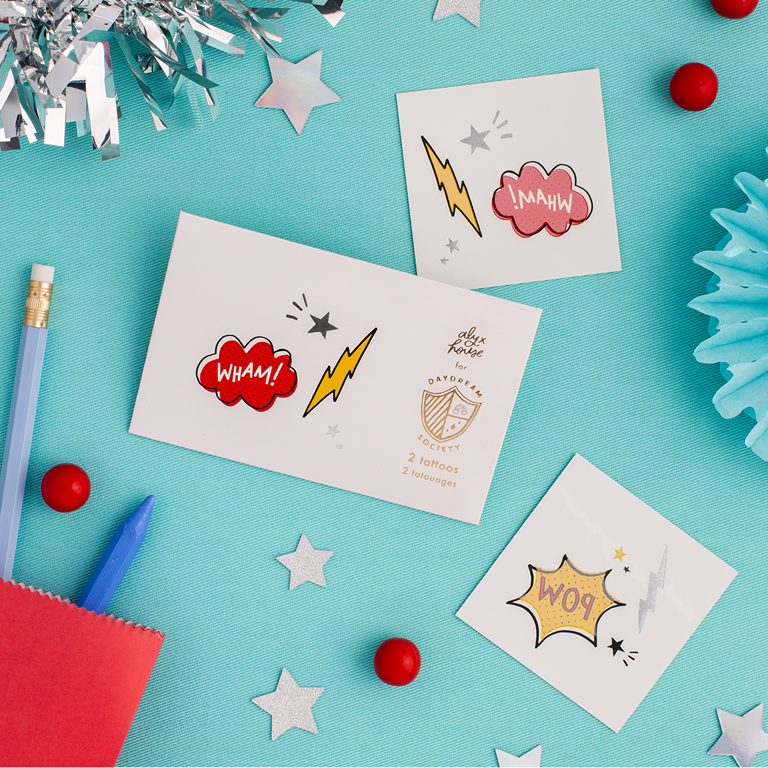 Zap! Bang! Pow! Wham! Featuring bold colors and silver foil, these tattoos have superpowers!