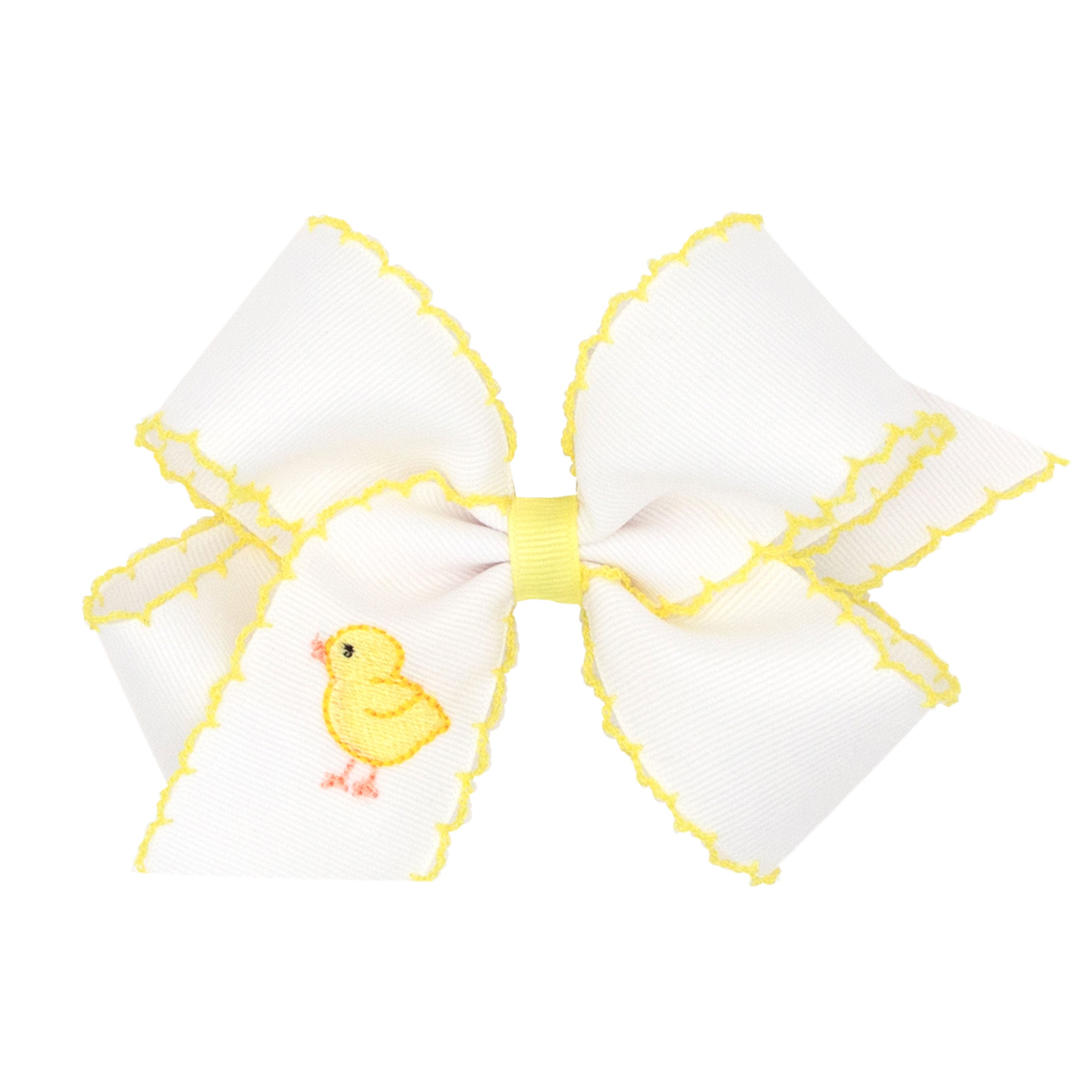 - This Wee Ones handcrafted hair bow is made with 2 1/4" moonstitch ribbon with a chick embroidered tail.