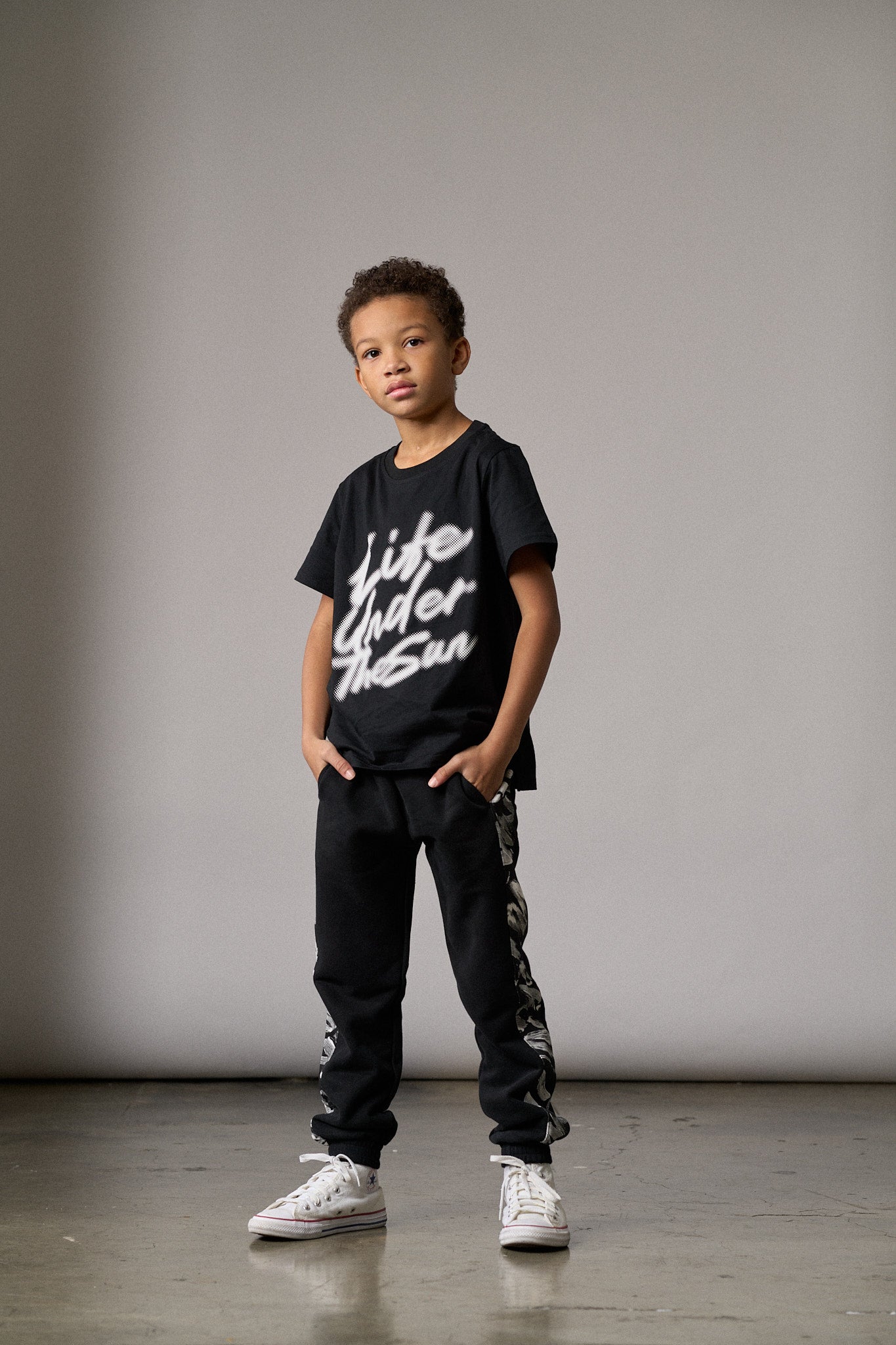 Introducing the "Life Under the Sun" Tee from our Modern Brushed Kids Clothing Collection, inspired by the classic technique of halftoning used in screen printing. In bold Black, this tee features a slight high/low bottom hem and side slits, creating a relaxed, easygoing fit perfect for all-day wear. With its simple yet meaningful “Life Under the Sun” graphic, this tee is a must-have for any child who loves to embrace carefree, sun-filled days with effortless style.