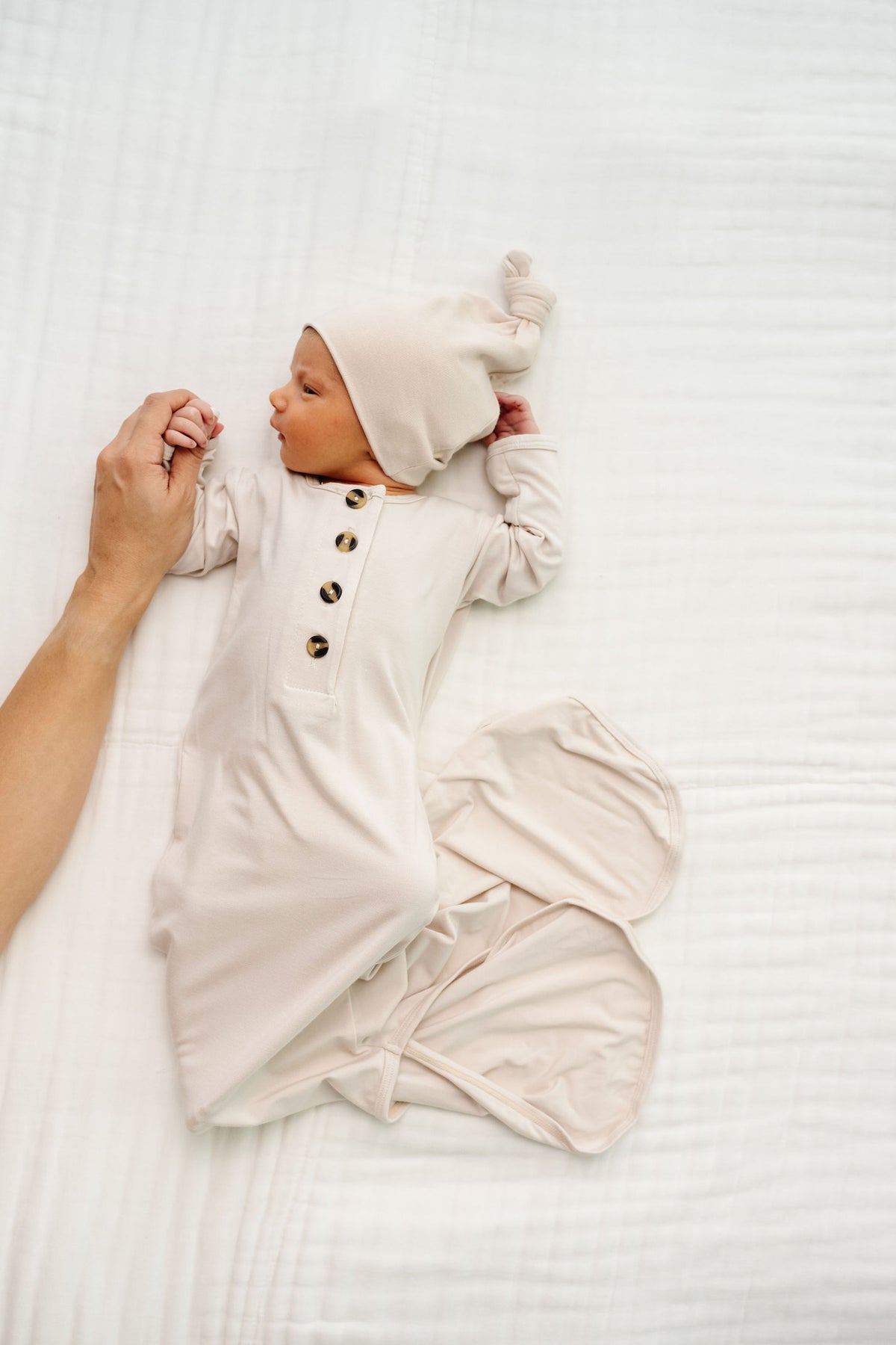- The easiest tie-bottom outfit for day or night. Made for hassle free diaper changes and gentle dressing, I designed this with a button-down front and tie bottom for simple closure (no more snaps at 2am!). Fold over wrist cuffs are the most thoughtful finishing touch.