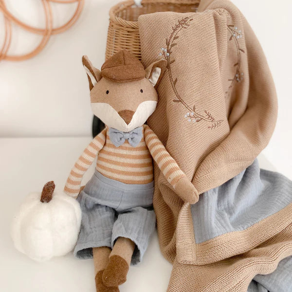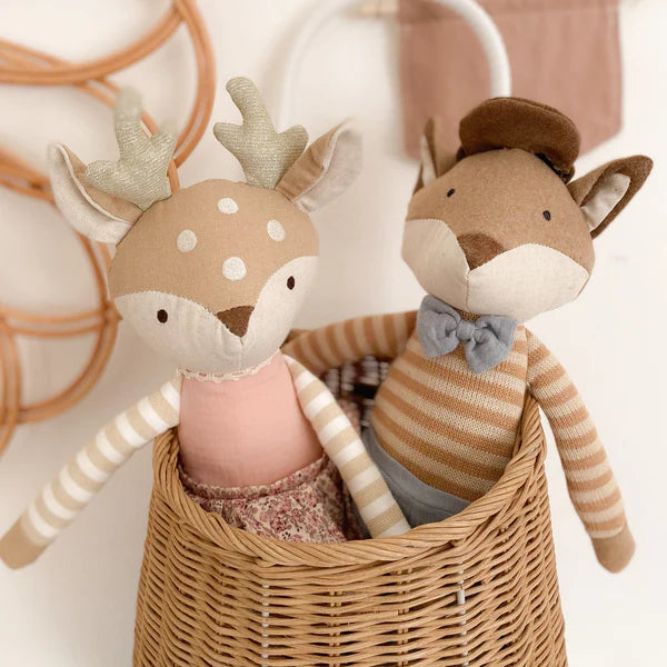 Meet Felix the Fox your little one's new best friend! This dapper stuffed doll is unbelievably soft and designed with exquisite detail, making him the perfect gift for any little one. Felix comes in a tweet hat, striped top, muslin pants and bow tie. As a birthday or holiday gift, this doll will be cherished for years to come. Pairs perfectly with Fleurette the Fawn, an adorable couple!