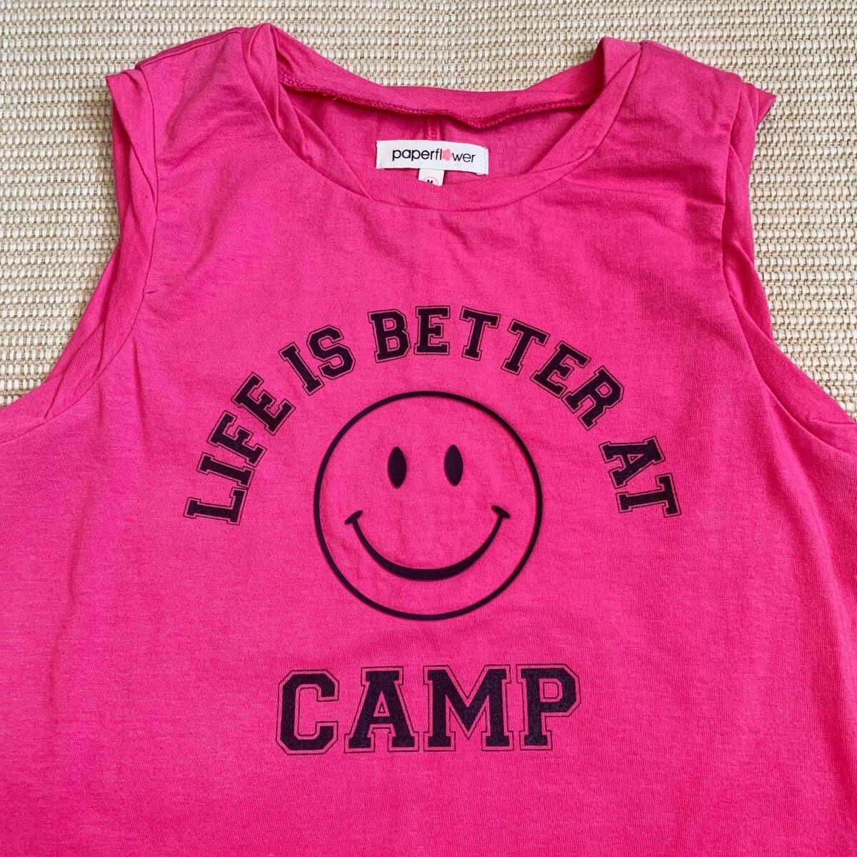 Introducing the Paper Flower Life is Better at Camp Twisted Tank! With its soft cotton fabric in hot pink, this twisted tank is the perfect summer item for road trips and camping. Available in sizes from small to Xlarge, you can spread the message of life being better at camp no matter your size.