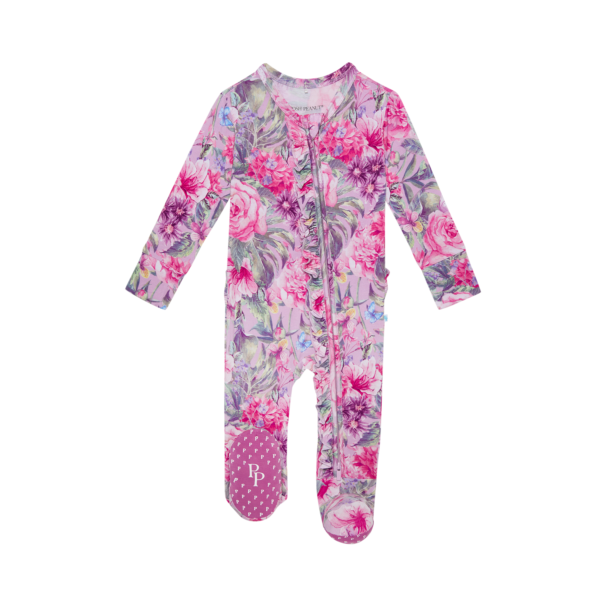 Viscose from bamboo one-piece footie coverall with reversible zipper opening. New reversible zippers are perfect for late-night changes and the ease of not undressing your peanut. Zip up or down for a quick change. Signature Posh Peanut Footie grips, elastic backing on footies for a snug fit and fold-over mittens in sizes NB and 0-3M. Buttery soft jammies so cute you can wear them out!