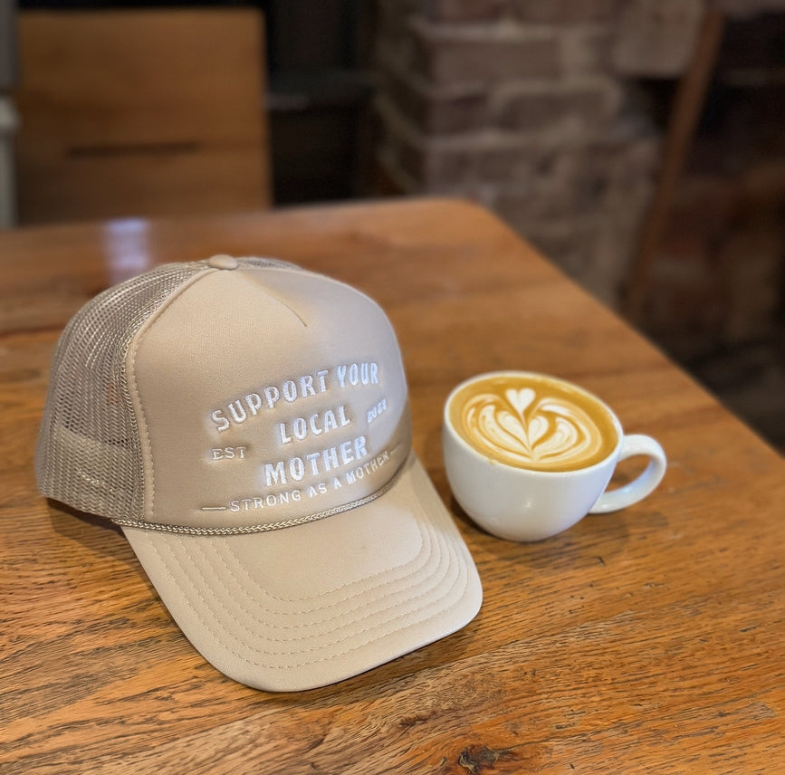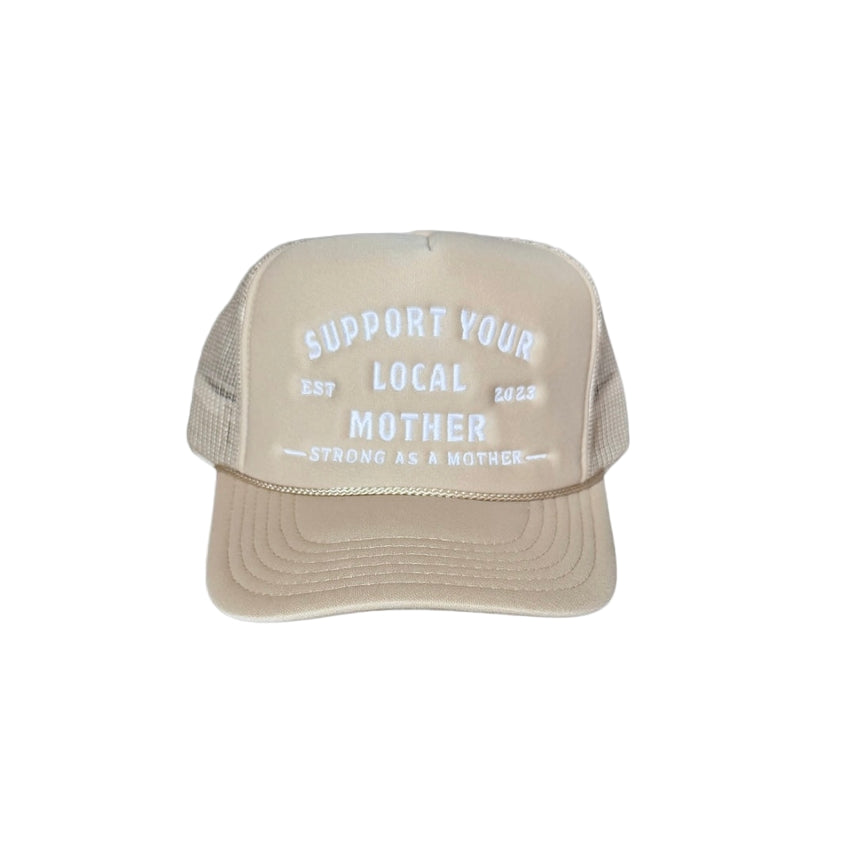 • Introducing the Support Your Local Mother® trucker hat in tan- because #momsneedmoms.