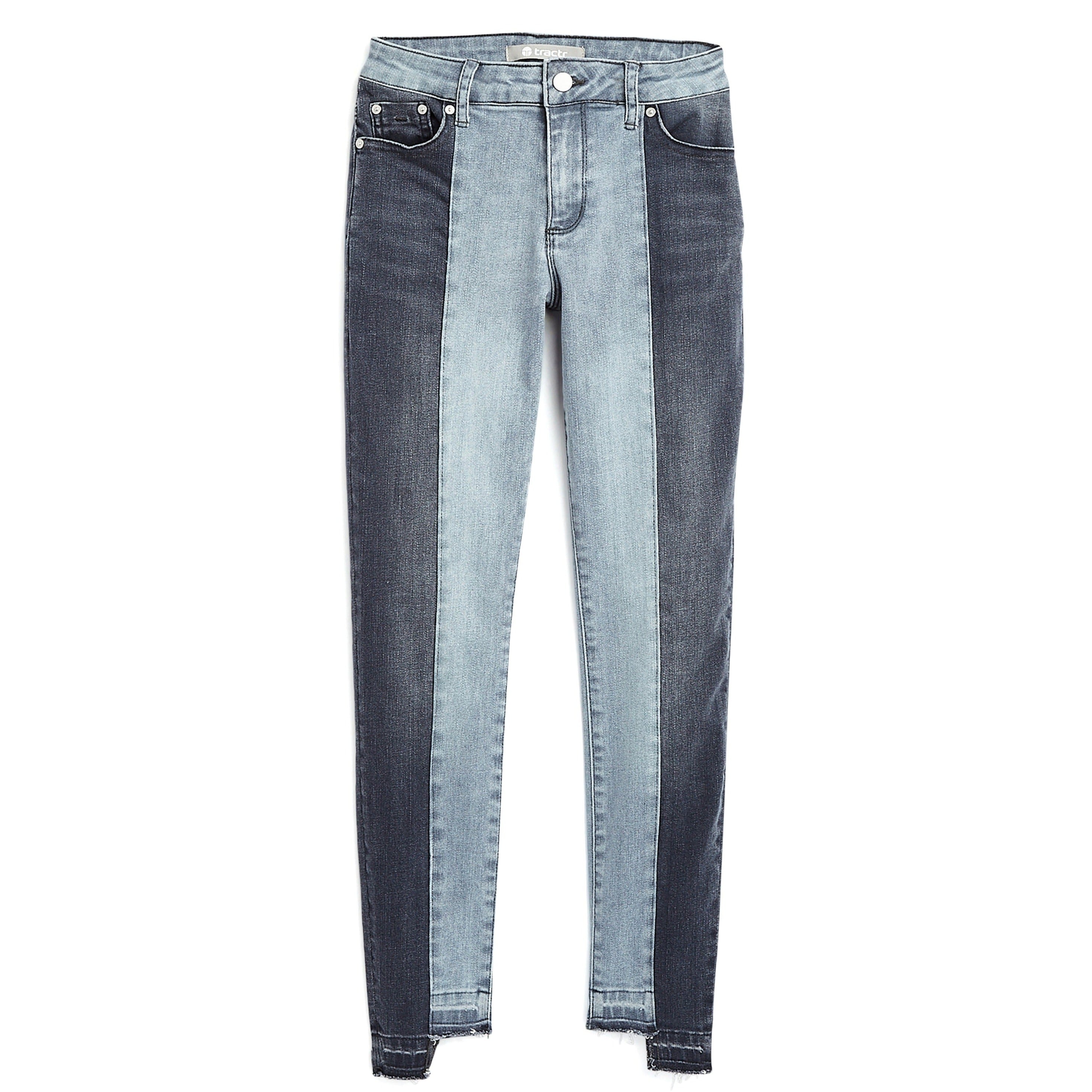 Designed in your favorite skinny silhouette, these jeans feature a patch denim combination and frayed bottom hem