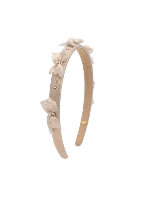 - The padded metallic headband is accented with sweet fabric bows adorned with Swarovski crystals.