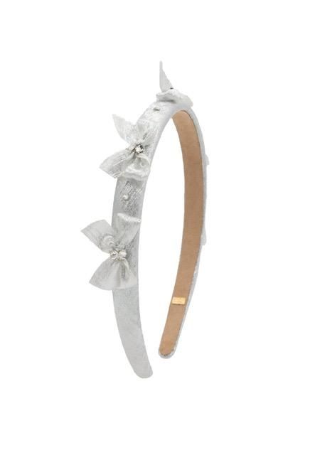 • The padded metallic headband is accented with sweet fabric bows adorned with Swarovski crystals.