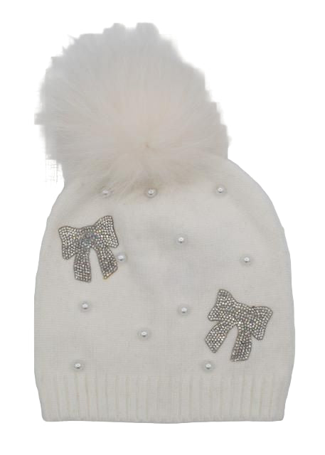 Bari Lynn Crystalized Bow with Pearls Fur Pom Hat - White