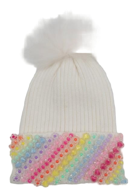 Bari Lynn Rainbow Charm Cuff Beanie with Fur Pom - Ivory