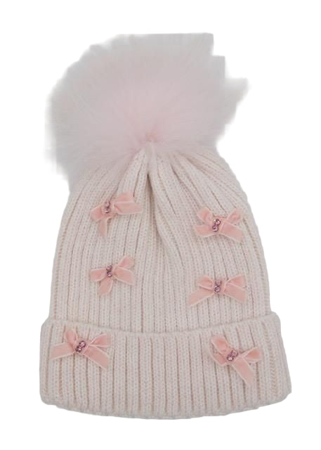 • Add little sophistication to her wardrobe with this pom knit hat from Bari Lynn, accented with the fluffiest pom, tiny velvet bows bow accented with crystals and a fluffy fur pom complete the look!